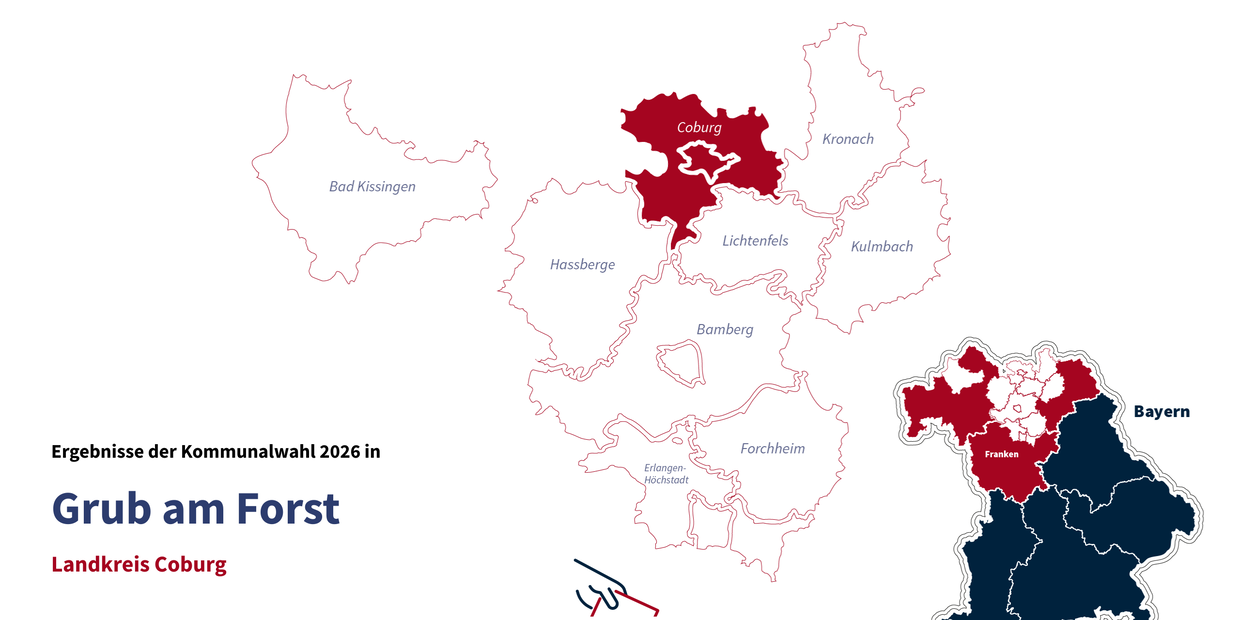 Verfolgen Sie auf dieser Seite den weiteren Verlauf des Wahlabends. Die Tabellen und Grafiken werden laufend mit den neuesten Ergebnissen der Gemeinderatswahl 2026 in Grub am Forst und der Bürgermeisterwahl 2026 in Grub am Forst aktualisiert.