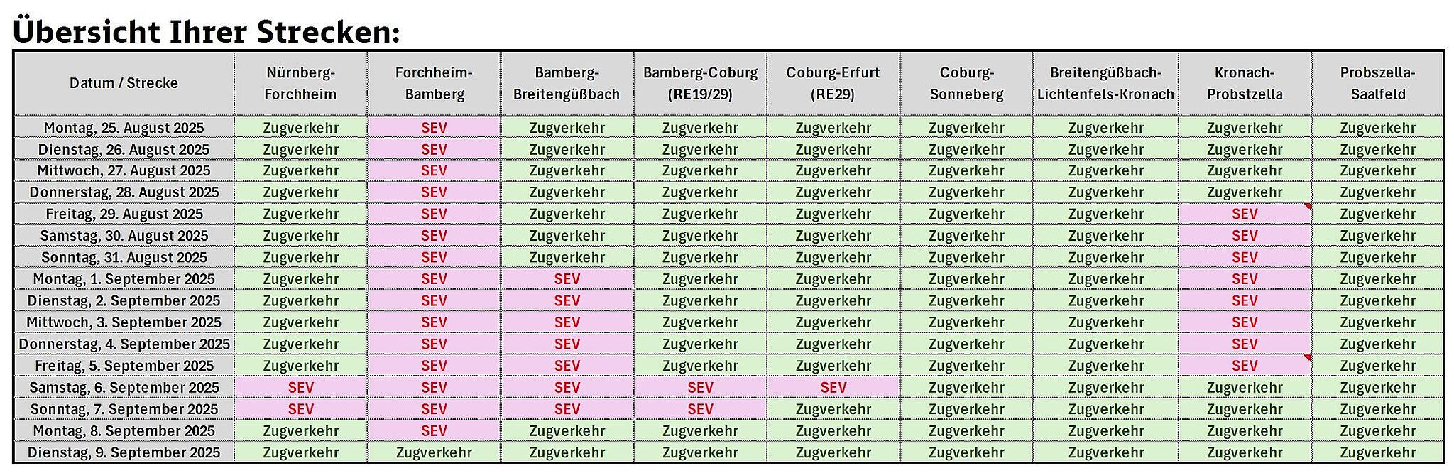 Nur zwei Tage keine Züge Kein ICE, dafür sonst fast alles wie immer Der Regionalverkehr ist am Coburger Bahnhof während der zwei Wochen nur an zwei Tagen ausgesetzt. // Pia Bayer/dpa von Tobias Götz TEILEN  14.08.2025 Coburg – Die Vollsperrung zwischen Forchheim und Bamberg bedeutet für Coburger Bahnreisende: zwei Wochen kein Anschluss an den Fernverkehr. Für Berufspendler und Regio-Reisende kommt es nicht ganz so schlimm. Artikel anhören Sie können uns nicht hören? Diese Funktion können Sie exklusiv mit PLUS nutzen. Erhalten Sie uneingeschränkten Zugriff auf alle Audioinhalte, Artikel und vieles mehr. Vorlesefunktion freischalten Bereits -Zugriff? Jetzt Anmelden Vom 25. August bis 9. September ist die Strecke zwischen Bamberg und Forchheim für umfassende Sanierungsarbeiten gesperrt. Um von Bamberg nach Forchheim zu kommen, ist für die komplette Zeit ein Schienenersatzverkehr notwendig. In Coburg ist nur der ICE-Verkehr für den gesamten Zeitraum eingestellt. Sperrung der Bahnstrecke: das ist der Grund Hintergrund ist die Fertigstellung des viergleisigen Ausbaus zwischen Altendorf und Strullendorf auf der Strecke München – Berlin. Auf dieser Strecke kam es in den Jahren zuvor immer wieder zu Verzögerungen. Zum Projekt gehören auch eine neue Güterzugverbindung und Brückenbauarbeiten. Zudem neue Bahnsteige in Hirschaid und Strullendorf. Die Deutsche Bahn beendet ihren vierspurigen Ausbau zwischen Bamberg und Nürnberg. Für etwas mehr als zwei Wochen kommt es daher zu Sperrungen und Schienenersatzverkehr. (Symbolbild) // Patrick Pleul/dpa Während zwischen Bamberg und Forchheim zwischen dem 25. August und dem 9. September durchgehend Schienenersatzverkehr notwendig ist, sind Bahnreisende ab Coburg bei den Regionalzügen zunächst nur an zwei Tagen eingeschränkt. Für Regio-Reisende aus Coburg kaum Einschränkungen Die gute Nachricht für Pendler: Nur am Samstag, 6. September und Sonntag, 7. September ist die Bahnverbindung zwischen Coburg und Bamberg gesperrt. An diesen Tagen ersetzt ein Schienenersatzverkehr den Bahnbetrieb. Für Berufspendler aufgrund des Wochenendes weniger einschränkend als die zweiwöchige Gesamtsperrung zwischen Bamberg und Forchheim. Stündlich fährt an diesen beiden Tage eine Expresslinie von Nürnberg nach Coburg mit einem Zwischenhalt in Bamberg. Streckenübersicht während der Sperrung vom 25. August bis 9. September 2025 // Infotabelle der Regio Bayern (DB) Ab Bamberg muss an den anderen Tagen natürlich dennoch in einen Schienenersatzverkehr umsteigen, wer weiter Richtung Forchheim und Nürnberg reisen möchte. Zwischen dem 1. September und dem 5. September verkehren deshalb auch rote Expresslinien zwischen Forchheim und Coburg direkt, wie die DB informiert. Damit kann ein Umstieg von Bahn zu Bus in Bamberg vermieden werden. Glosse: Vesteblick KI behauptet: Coburger Puppenmuseum ist „Touristenfalle“ Sachen gibt’s, die gibt’s gar nicht! Mithilfe von künstlicher, aber eben nur vermeintlicher Intelligenz wurden die schönsten Urlaubsorte in Deutschland gesucht. Das Ergebnis ist ein schlechter Witz. Für die Sperrung der Strecke Coburg – Erfurt, die nur am Samstag, 6. September greifen wird, ist ebenfalls ein Expressbus zwischen Coburg und Erfurt eingerichtet, der keinen Zwischenstopp macht. ICE in Coburg entfällt Der ICE zwischen Berlin und München indessen hält vom 25. August bis zum 9. September gar nicht in Coburg: Er fährt einen Umweg über Augsburg und Würzburg und braucht somit 100 Minuten länger für die ganze Fahrt. Ein mindestens zweistündiger Rhythmus soll laut Bahn dennoch eingehalten werden. Einen ICE wird man zwischen dem 25. August und 9. September nicht im Coburger Hauptbahnhof einfahren sehen. // Simone Bastian Neben Coburg entfallen im kompletten Zeitraum auch die ICE-Halte in Bamberg und Erlangen. Reisende aus Coburg können also nur in Nürnberg oder Würzburg in den ICE umsteigen. Traditionsreiches Restaurant Neuer Pächter für Ratskeller in Coburg gesucht Wer haucht dem altehrwürdigen Ratskeller wieder Leben ein? Bis Anfang 2025 befand sich dort ein mexikanisches Lokal. Der Oberbürgermeister würde sich gerne wieder fränkische Küche wünschen. Eröffnung im Herbst geplant Warum sich „Butlers“ für das kleine Coburg entschieden hat Normalerweise siedelt sich die Deko- und Einrichtungskette nur in Städten mit mehr als 100.000 Einwohnern an. Eine Sprecherin erklärt, warum man Coburg trotzdem für einen interessanten Standort hält. Überblick Sperrungen Baustellenland Coburg – aber eine gute Nachricht gibt's Coburg Stadt und Land: gefühlt eine einzige große Baustelle. Wir zeigen nochmal auf einen Blick, wo überall gesperrt ist – und wissen schon von einem Lichtblick.