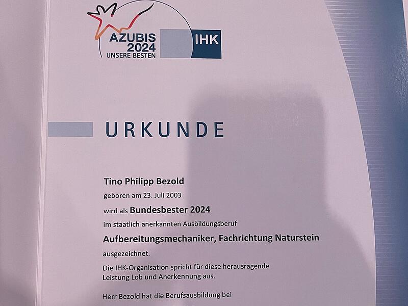 Bester Azubi Ein Deutscher Meister kommt aus Azendorf Bergmann-Azubi Tino Philipp Bezold mit DIHK-Präsident Peter Adrian // Foto: DIHK von Redaktion TEILEN  13.12.2024 Kasendorf – Tino Philipp Bezold von der Azendorfer Firma Bergmann Kalk ist einer von Deutschlands besten Azubis. Der 21-Jährige wurde in Berlin ausgezeichnet. Die besondere Auszeichnung erhielt der 21-Jährige, der bester Auszubildender als Aufbereitungsmechaniker in der Fachrichtung Naturstein ist, im Rahmen der „Nationalen Bestenehrung“ der Industrie- und Handelskammern (DIHK) in Berlin. Die Bundesbesten hatten bei ihren Abschlussprüfungen die höchsten Punktzahlen erreicht und sich damit unter rund 250.000 Prüfungsteilnehmern durchgesetzt. Auch Robert Habeck gratulierte Peter Adrian, Präsident der Deutschen Industrie- und Handelskammer (DIHK), sowie Vizekanzler und Bundeswirtschaftsminister Robert Habeck gratulierten den Preisträgerinnen und Preisträgern, die mit Pokalen und Urkunden ausgezeichnet wurden. Diese Spitzen-Azubis aus Bayern setzten sich unter 250.000 Prüfungsteilnehmern durch. // Foto: DIHK Habeck betonte den hohen Stellenwert der individuellen Bestleistungen der Auszubildenden: „Qualifizierte und engagierte Auszubildende von heute sind unsere Fachkräfte von morgen. Ich freue mich daher besonders, dass ich heute die Auszubildenden ehren kann, die sich mit großartigen Leistungen hervorgetan haben." Diese Urkunde wurde Tino Philipp Bezold überreicht. // Foto: Bergmann Kalk „Wir freuen uns mit Tino und sehen in der Auszeichnung einen Beleg für die gute Qualität der Ausbildung in unserem Haus“, erklärt Katharina Straßburger-Groppweis, Prokuristin und Leiterin Personal beim Hersteller Bergmann Kalk. Sie betont zugleich, dass eine gute Ausbildung gerade in Zeiten des Fachkräftemangels von besonderer Bedeutung ist. +++ Bleiben Sie mit der Bayerischen Rundschau auf dem Laufenden und holen Sie sich jetzt unsere kostenlosen Newsletter. +++ Das Familienunternehmen, zu dem auch die Maxit-Gruppe gehört, beschäftigt etwa 850 Mitarbeiter und bietet jährlich verschiedenste und spannende Ausbildungsplätze in Technik und Verwaltung an. Am Stammsitz in Azendorf verfügt das Unternehmen über das größte Trockenmörtelwerk Deutschlands und sorgt mit seinen weiteren Standorten für eine Spitzenposition am deutschen Markt bei der Lieferung von Kalkprodukten. Lesen Sie auch Ende 2024 ist Schluss „Die Zeit ist da“: Weismainer Konditorei Besold schließt Fußball-Star Giovane Élber hat bei Franz und Barbara Besold Kaffee getrunken, Sänger Karel Gott Eis gegessen. Das Café Besold ist weit über die Grenzen Weismains hinaus bekannt. Interview mit Stadtplaner Uni-Prof Miosga: Städte sollen wie ein leckerer Krapfen sein Außen fett, innen hohl wie ein Donut – genau so sollen Städte nicht aussehen, wenn es nach Manfred Miosga geht. Der Professor für Stadt- und Regionalentwicklung an der Uni Bayreuth fordert einen aktiven Wandel der Städte.