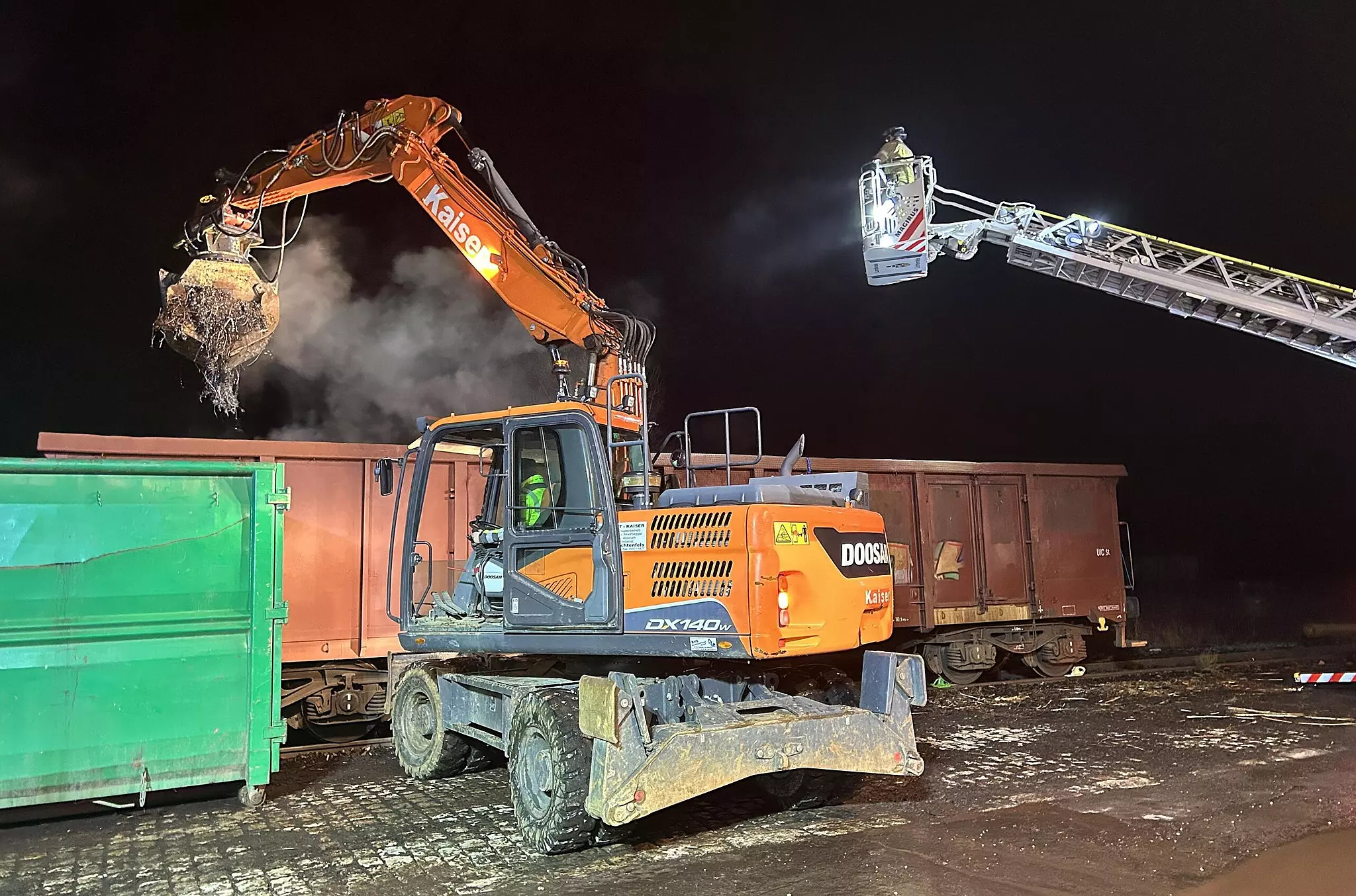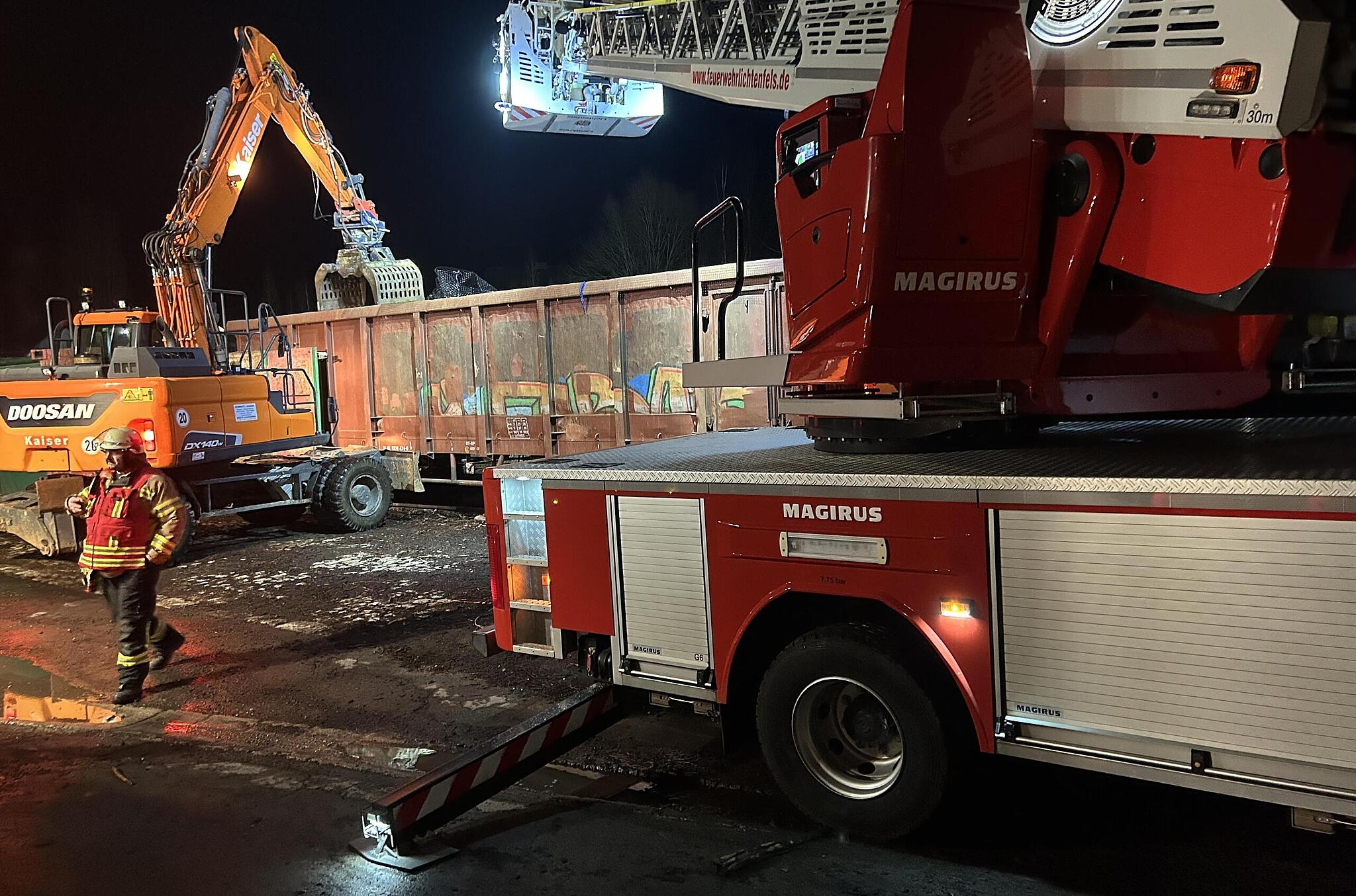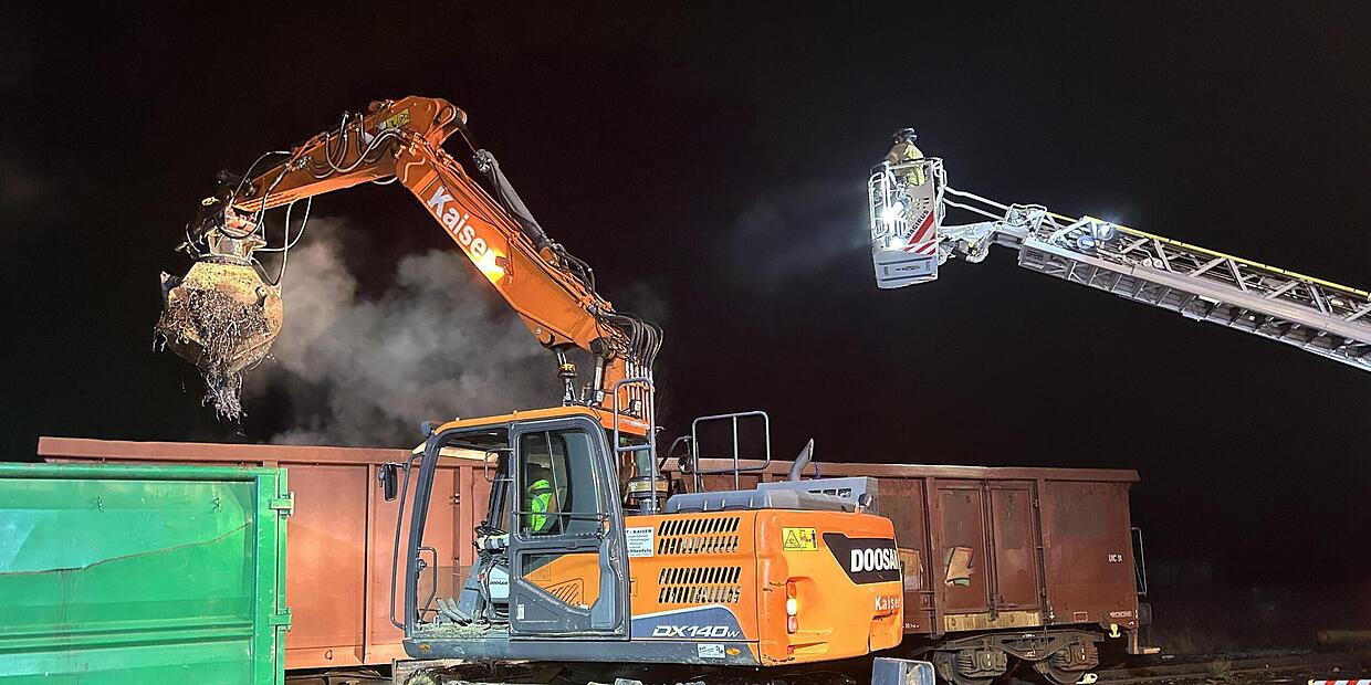 Lichtenfels Ungewöhnlicher Brand in Güterwaggon Die Feuerwehr hat den Waggon mit einem Bagger geleert. // FW Lichtenfels von Redaktion TEILEN  12.02.2025 Lichtenfels – Die Feuerwehren aus Seubelsdorf und Lichtenfels haben auf eine unkonventionelle Löschmethode gesetzt. Artikel anhören Sie können uns nicht hören? Diese Funktion können Sie exklusiv mit PLUS nutzen. Erhalten Sie uneingeschränkten Zugriff auf alle Audioinhalte, Artikel und vieles mehr. Vorlesefunktion freischalten Bereits -Zugriff? Jetzt Anmelden Die Feuerwehren Seubelsdorf und Lichtenfels sind am Dienstagabend mit dem Alarmstichwort „Brand Müllcontainer“ ausgerückt. Was sie vor Ort jedoch vorfanden, war kein brennender Müllcontainer, sondern ein offener vierachsiger Güterwaggon der Bahn, in dem Metallspäne und gehäckselter Metallschrott brannten. Das geht aus einer aktuellen Meldung der Feuerwehr hervor.Schmierstoffe und ÖleDie Erkundung am Einsatzort bestätigte einen Brand innerhalb der Ladung, der jedoch nicht hochtemperiert war. Stattdessen handelte es sich um einen Brand der enthaltenen Schmierstoffe und Öle. Die Lage war schnell unter Kontrolle. // FW Lichtenfels Die Feuerwehrleute entschieden sich daher für eine ungewöhnliche Bekämpfungsmethode: das Entfernen des Brandguts. Unterstützt von der Firma Schrott Kaiser aus Lichtenfels, die einen Greifbagger und eine Mulde zur Verfügung stellte, entfernten die Feuerwehrleute mehrere Tonnen Material aus dem Waggon.Begrenzter BrandbereichDabei stellte sich heraus, dass das Brandereignis auf einen Randbereich des Waggons begrenzt war und kein offenes Feuer mehr vorhanden war. Durch die Maßnahme konnte eine weitere Ausbreitung des Brandes auf die gesamte Ladung im Waggon verhindert werden. Eine weitere Brandbekämpung mit Löschmitteln erwies sich als nicht notwendig und sinnvoll. Umweltbelastung vermeidenDa dies zusammen mit den Schmiermitteln zu einer möglichen Umweltbelastung geführt hätte, wurde darauf verzichtet. Die Kreisbrandinspektion, die Polizei und der Notfallmanager der Deutschen Bahn waren ebenfalls im Einsatz. red
