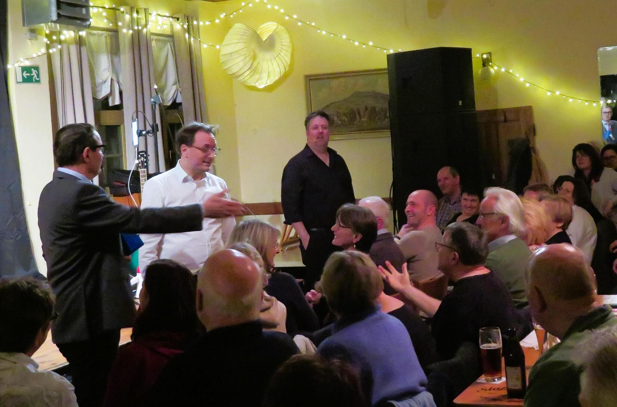 Brauereisaal Loffelder Fasching : „Es soll roten Pressack regnen“ Beratung statt Krisensitzung: Wenn eine Person durch die Kirche etwas „Zuwendung“ erfährt, dann ist es wieviel Euro wert ...? // Monika Schütz von Monika Schütz TEILEN  30.01.2023 Loffeld – Lachen bis zum Schluss – in Loffeld hat das Totale Bamberger Cabarett es wieder krachen lassen. Doch gab es auch eine Abschiedsträne zu verdrücken. Schon lange vor Beginn um 20 Uhr war der urige Brauereisaal in Loffeld restlos gefüllt. Ob die Zuschauer da schon wussten, dass eines der Urgesteine die Gruppe TBC verlässt? Auf seiner Internetseite hatte das Trio neben den restlichen Terminen der Spielzeit bis März noch keinen Hinweis gepostet. Dennoch sickerte durch, dass es Michael A. Tomis sei. Tomis spielt seit elf Jahren den Pfarrer, den Metzger, er singt, musiziert und tanzt in den verschiedensten Rollen. Seine Sketche sind unvergessen, seine Rammsteinparodie auf den 1950er Schlager „Knallrotes Gummiboot“ eine unglaubliche Inszenierung und seine Stimmenimitation von Grönemeyer und Lindenberg sucht seinesgleichen. Abschied mit Humor Tomis stieß als „Ablösung“ von Helmut Vorndran zur Gruppe. Da hatte der „Preuße“ Georg Koeniger schon den Platz von Daniel Schmidt eingenommen und Florian Hoffmann den von Mäc Härder. 1986 wurde TBC mit Vorndran, Schmidt und Mäc Härder richtig bekannt. „Wenn du gehst, haben wir wieder mehr Platz auf der Bühne“, stichelte Florian und blickte auf Tomis’ Bäuchlein. „Der Neue ist genau so wie ich“, konterte der. Auch das Publikum kriegt was ab „Als TBC zum ersten Mal eine Bühne betrat, gab es noch Wählscheibentelefone, vierstellige Postleitzahlen – und die Oberpfalz wurde gerade ans Stromnetz angeschlossen“, rief er die Zeit Ende der 1980er in Erinnerung. Das Publikum lacht herzhaft. „Hallo? Was will man von so einem Pulikum im unteren Preissegment erwarten? Seien Sie froh, dass es keine Oberpfälzer sind!“ // Monika Schütz Eigentlich hätte es auch beleidigt sein können: Gleich im ersten Sketch des Abends wurde es noch als „naja, was willst im unteren Preissegment schon erwarten“ bezeichnet. Corona war eine harte Zeit „Ich mag sie alle drei, die Jungs“, grinste Tanja Dowerg vom Organisationsteam. „Ausverkauft“ – genau das ist es, worauf viele Künstler und Veranstalter seit langem gewartet hätten. „Im Herbst haben wir teils vor halbvollen Sälen gespielt“, denkt Michael A. Tomis einige Monate zurück. Die Leute hätten Angst vor Corona gehabt, seien vielleicht selbst erkrankt oder wollten ihr Geld sparen, mutmaßt der Künstler. Der wahre Grund des Ausstiegs Dass Tomis selbst auch schwer an Corona erkrankt war, erzählt er schon zu Beginn der mehr als zweistündigen Veranstaltung. Auch, dass er unter Long Covid leide und vielleicht mal zum Husten die Bühne verlassen müsste. Das war kein Scherz. „Dann spielen wir halt lauter“, beruhigte Georg die Gäste. Ob das der Grund ist, das Erfolgstrio TBC (Totales Bamberger Cabarett) zu verlassen? „Nein, ich muss jetzt endlich das Bordell meines Vaters übernehmen“, erklärte Tomis. Er überzeugt mit seiner Mimik. Es soll roten Pressack regnen Die drei Kabarettisten brauchen nicht viel an Requisiten oder gar Dekoration. Ein Tisch, drei Stühle, das reicht. Hier spielen sie die Höhepunkte der letzten 35 Jahre TBC. „Bevor wir’s vergessen“ heißt das Programm – ein Garant für Lachsalven aus dem Publikum, Zwischenapplaus und Kurzweil. Der Metzger-Song, alias Hildegard Knef: „Für mich soll’s roten Pressack regnen“ // Monika Schütz Bei den größten Lachnummern darf natürlich der Metzger-Song nicht fehlen. Hildegard Knefs Chanson „Für mich soll’s rote Rosen regnen“ wurde umgetextet in „Für mich soll’s roten Pressack regnen“. Die Entstehung der Oberpfalz Als kompletter Wahnsinn erwies sich die Schöpfungs-Baustelle mit Petrus und Gott. Problem: Der Staffelberg ist mit 8000 Metern zu hoch geworden. Er muss rückgebaut werden. Ergibt sich die Frage: Wohin mit dem Bauschutt? Schöpfungsbaustelle: Petrus (l.) zu Gott : „Wir haben da ein Problem …“ // Monika Schütz Petrus’ Idee ist einfach: Wegschaffen, Zaun drum und schon haben wir die Oberpfalz geschaffen. Das Publikum johlt mittlerweile, Tomis lobt es stolz: „Ihr seid eines der sympathischsten Publikumse!“ Georg, Preuße aus NRW, kommt da nicht mit. Der gebürtige Münsteraner hat schon Schwierigkeiten, die Uhrzeit zu erkennen, wenn ihm ein Franke die Zahl „viertel zwölf“ nennt. Das Publikum ist begeistert Leider sind viele Nummern noch heute aktuell, etwa der Missbrauch und die Zahlungen der Kirche an die Opfer oder der rüde Umgangston der Parlamentarier. Und auch die Warnung für Reisende kann nicht oft genug wiederholt werden: „Fahren Sie nicht in die Oberpfalz! Dort gibt es soviel Inzucht, dort sind manche Leute sogar ihr eigener Vater.“ Zweieinhalb Stunden später und nach mehreren Zugaben lassen die drei Künstler ein begeistertes Publikum zurück. Viele sind von weit her gekommen, ein Autokennzeichen aus der Oberpfalz wurde allerdings nicht gesichtet. Eine Frage blieb für Michael Tomis schließlich offen: „Wie gendert man herrenloses Damenfahrrad?“ Lesen Sie auch: Kabarett Ein Nordlicht in Bad Staffelstein Mit spitzer Zunge und hintergründigem Humor begeistert Helga Siebert ihr Publikum. Mit dabei sind ihre „Nachbarin“, ein besonderer Gast und die Erkenntnis, dass verheiratete Männer länger leben. Stallgespräch Tierwohl bis zum Ruin: Viele Landwirte geben auf Den Landwirten der Region Lichtenfels steht das Wasser bis zum Hals: Immer neue Gesetzentwürfe zwingen viele Betriebe zur Aufgabe. Auch in Serkendorf blickt Familie Weis in eine ungewisse Zukunft.