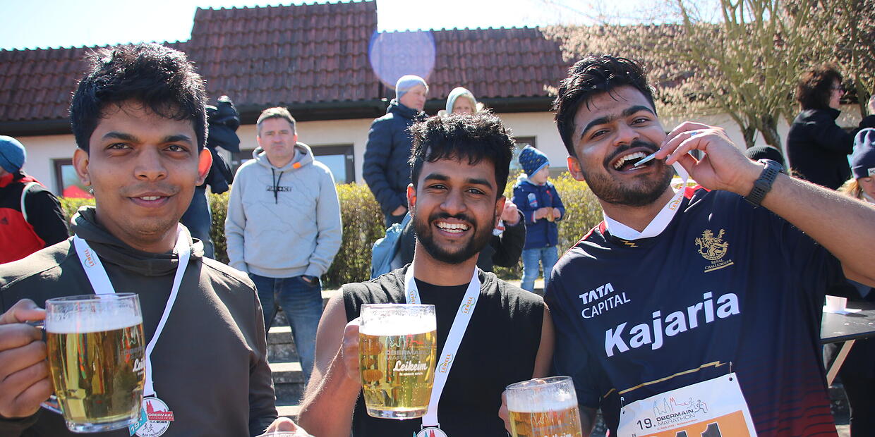 – Für die Jahreszeit eindeutig zu kalt war es beim Obermain-Marathon in Bad Staffelstein. Das merkten auch drei Studenten aus Indien, die den Halbmarathon liefen. Aber trotz Gänsehaut im Ziel ließen sie sich erstmal ein Bier schmecken.