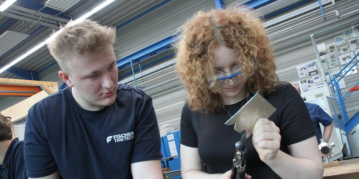– Mit Blechschere und Schweißerbrille: Angehende Realschul-Absolventen schnuppern bei der Burgkunstadter Maschinenfabrik Fischer Tire Tech in die Berufswelt hinein.