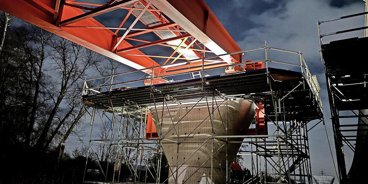 Bei den Bauteilen bewegen die Bauarbeiter große Massen: Das längste Element misst etwa 26 Meter und wiegt rund 103 Tonnen, das kürzeste knapp 12 Meter bei 37 Tonnen Gewicht. Für den Transport der schwersten Bauteile ist ein 4-achsiges Zugfahrzeug mit 12-achsigem Aufleger nötig, was eine Gesamtlänge von 36 Metern ergibt.