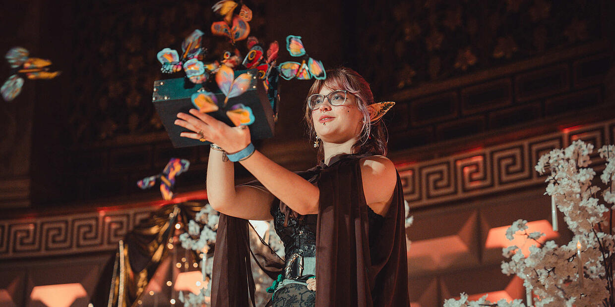 Zu den festen Bestandteilen des Abends gehört auch ein kleiner Markt in den Wandelhallen. Dort präsentieren Kunsthandwerker ihre Arbeiten: feine Diademe, kunstvolle Flügel oder aufwendige Requisiten, die an Märchen und Sagen erinnern. Für bleibende Erinnerungen sorgen Fotoecken und eine 360-Grad-Kamera, die die oft sorgfältig vorbereiteten Gewandungen festhält.