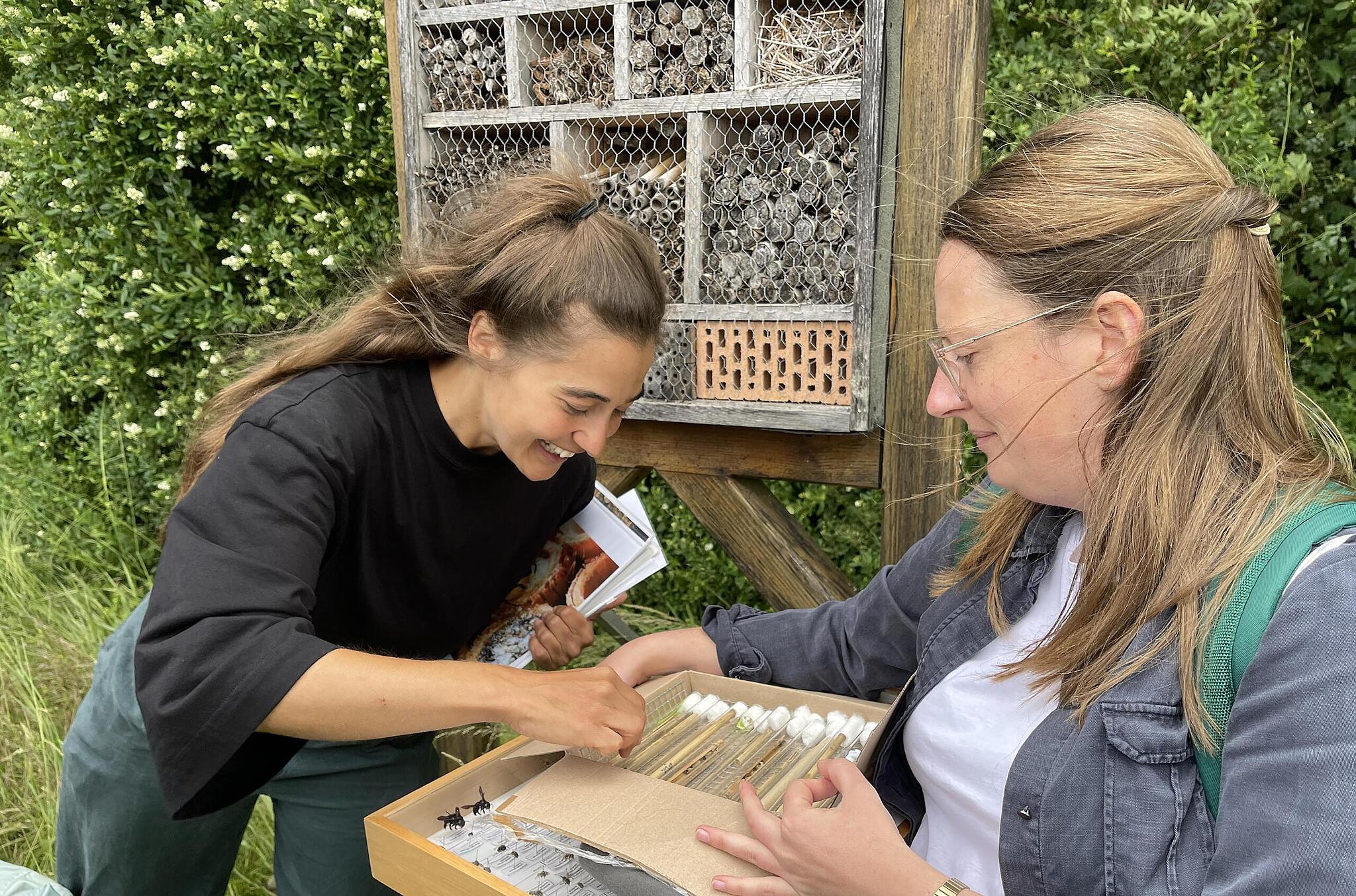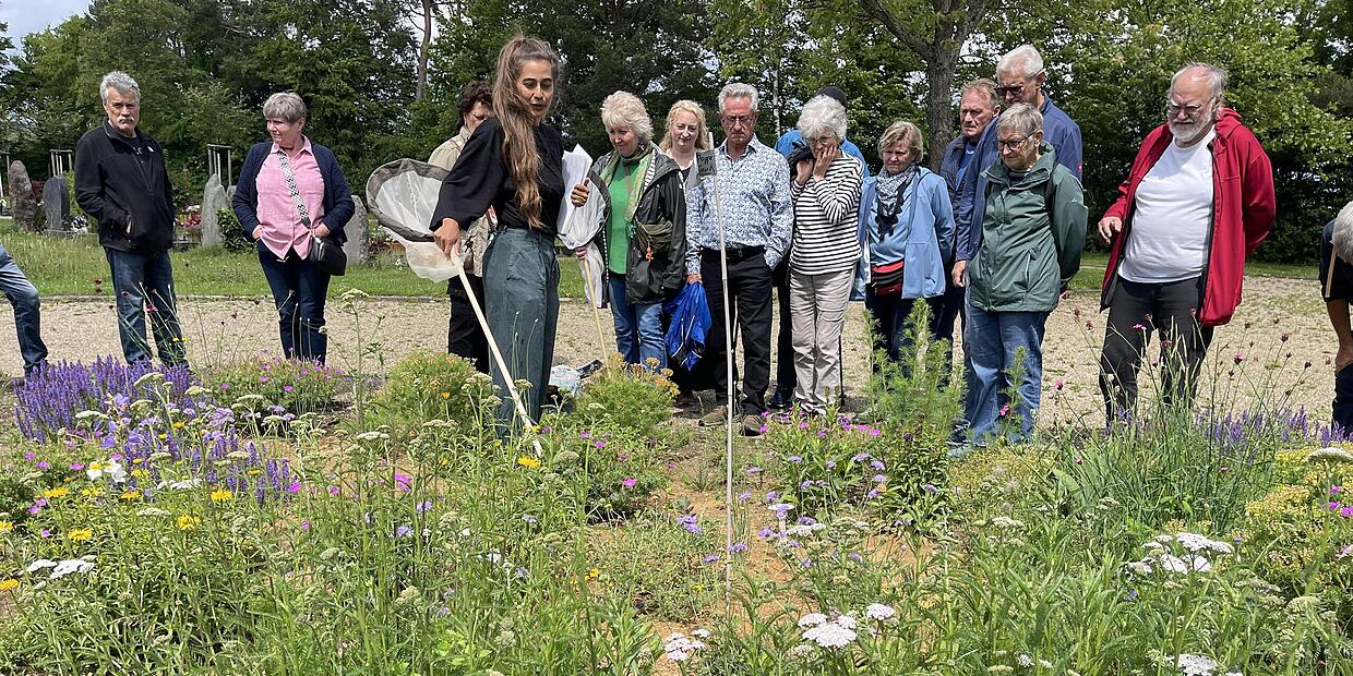 Natur Summende Dörfer, lebendige Gärten Dr. Fabienne Maihoff zeigt, was im Dorf an Straßenrändern, Gärten und öffentlichen Flächen an Insektenvielfalt zu finden ist. // Elisabeth Assmann von Elisabeth Assmann TEILEN  16.06.2025 Poppenroth – Mit dem Bund Naturschutz ging es jetzt durch Poppenroth, um zu zeigen, was sich bei dem Projekt für Wildbienen schon getan hat. Der Bund Naturschutz hatte zu einen Rundgang durch Poppenroth eingeladen, um wildbienen- und insektenfreundliche Ecken und Gärten zu besuchen. Und die rund 30 Teilnehmer und Teilnehmerinnen wurden mehr als belohnt. Dr. Fabienne Maihoff von der Uni Würzburg und Dr. Marina Wolz vom Biodiversitätszentrum Rhön stellten das Forschungsprojekt „Summende Dörfer – Wildbienen in Dörfern“ vor. Im abgeschlossen ersten Teil des Forschungsprojektes konnten in 40 Dörfern 1200 blühenden Pflanzenarten und 247 verschiedene Wildbienenarten festgestellt werden. Im nun laufenden zweiten Teil des Projektes wurden 20 Dörfer ausgewählt, in denen die Kommune, Vereine und Bürgerinnen und Bürger konkret mehr Lebensraum für Wildbienen schaffen. Start war damit in Poppenroth im vergangenen Jahr. 2024 fand das erste Treffen des Projektes mit rund 25 Personen statt und bereits ein Jahr später waren mindestens 15 Maßnahmen umgesetzt. Es wird weniger gemähtAuch die Stadt Bad Kissingen ist auf ihren Flächen engagiert: So wird nur ein Meter der Grünflächen öfter gemäht, der sogenannte Akzeptanzstreifen. Die restliche Fläche wird nur ein bis zweimal im Jahr gemäht, das Mahdgut abgefahren und nicht gemulcht. Hier gibt es öfter Diskussionen mit Bürgern, erklärt Christina Martin, die die Grünflächen der Stadt Bad Kissingen mit betreut. Über 15 Flächen wurden bereits insektenfreundlich umgestaltet. Darunter befinden sich der neu gestaltete Dorfplatz, der Friedhof, weitere öffentliche Flächen, aber auch viele private Gärten. Beim Rundgang durch den Ort fielen zahlreiche schmale Randstreifen auf, die insekten- und wildbienenfreundlich umgestaltet wurden. Aber auch das einfache Wachsenlassen von Wildpflanzen oder das bewusste Genießen blühender Wiesen – aktuell etwa der weiß blühenden Margeriten – tritt zunehmend an die Stelle pflegeintensiver Rasenflächen. Hummelnester in MauselöchernHinweise auf Mauselöcher, die jetzt als Hummelnester für rund 600 Individuen dienen oder dass durch Vlies versiegelte Böden, auch den Wildbienen keinen Lebensraum böten, ließen den dreistündigen Spaziergang wie im Nu vergehen. „Wir möchten nachhaltig so viel Lebensraum wie möglich für Wildbienen und alle anderen Insekten schaffen“, erläutert Dr. Maihoff das Ziel des Projektes, „das geht am besten, wenn wir die Kommunen und deren Bürgerinnen und Bürger vor Ort überzeugen und mitnehmen.“ Denn schließlich haben 79 Prozent der Haushalte in Deutschland einen Garten, Balkon oder eine Terrasse, die naturnah genutzt werden können. Unter den Teilnehmern und Teilnehmerinnen waren auch Stadrat Bernhard Schlereth und Imker Philipp Kreile, die sich bei der Umsetzung in Poppenroth stark engagiert haben. Ein gelungenes Beispiel für artenreichen Blühflächen und offen gehaltenen Flächen, die für Veranstaltungen genutzt werden können, ist der neugestaltete Dorfplatz. Hier verbinden sich ordentlich angelegte Staudenbeete mit bewusst belassenen „wilden“ Ecken, in denen vermeintliche Unkräuter zum Wohl der Wildbienen wachsen dürfen. Sandarium für WildbienenAuch offene Bodenstellen wurden bewusst integriert, da diese für den Nestbau vieler Wildbienenarten unverzichtbar sind. In diesem Zusammenhang wurde auch ein von den Bürgern Poppenroths eigens angelegtes Sandarium besichtigt – ein spezieller Lebensraum, der gezielt den Bedürfnissen bodennistender Wildbienen gerecht wird. Philipp Kreile, der vor Ort die Bürger in Poppenroth motiviert, hat ungewaschenen Sand von einer Baufirma organisiert und verteilt, sodass noch weitere hügelförmige Sandarien angelegt werden konnten. Für Nachahmer als Tipp: ungewaschener Sand kann bei Baustellen anfallen, daher lohnt es sich, bei Baufirmen anzufragen. Liguster darf blühenEs fällt auf, dass der Liguster als Hecke blühen darf. Überhaupt sind die Übergänge und die Vielfalt von Wiesen zu Hecken zu Nutz- und Ziergärten wichtig für die Artenvielfalt an Pflanzen und Insekten. Dass auch Neophyten (nichtheimische Pflanzen) wie etwa die gelbblühende Schafgarbe von heimischen Insekten wie etwa der Maskenbiene angenommen werden, war am Dorfplatz zu beobachten. Leider ist aber nicht jede im Verkauf als bienenfreundlich ausgezeichnete Pflanze wirklich insektenfreundlich. Stark gezüchtete Sorten – unabhängig davon, ob sie gebietsfremd oder gebietsheimisch sind, produzieren kaum noch Nektar oder Pollen und bieten daher nur wenig Nahrungswert für Insekten. Außerdem gibt es unter den Wildbienen auch viele Spezialisten, die auf eine oder wenige bestimmte Blühpflanzen angewiesen sind. Ein Beispiel ist die Zaun-Wicken-Sandbiene, deren Hauptpollenquelle Wicken und Blatterbsen sind. Ohne diese Wildpflanzen fehlt die Nahrungsgrundlage. Schmetterlinge beim FriedhofWeiter ging es zum Friedhof, dort flatterten trotz Wind etliche Schmetterlinge an den Skabiosen. Wiesen-, Stein-, Ackerhummel, Schwebfliegen, Gartenwollbienen, Mauerbienen, Scherenbienen und viele weitere Insekten wurden den Interessierten vorgestellt und zeigte die Vielfalt der Insektenwelt. An einem Insektenhotel erklärten Maihoff und Wolz, auf was es ankommt. Markhaltige Stängel, verschieden große, tiefere Lohrböcher quer zum Stirnholz, um Risse in den Brutröhren zu vermeiden. Als ein weiterer Höhepunkt der Tour folgte der neu gestaltete Garten von Marion Kröckel. Hier zeigte sich, dass ein naturnah gestaltetes Kiesbeet ein wertvoller Lebensraum nicht nur für Wildbienen, aber auch für andere Insekten sein kann und Ästhetik und insektenfreundlich kein Widerspruch sind. Nach der Rundtour waren sich alle eini