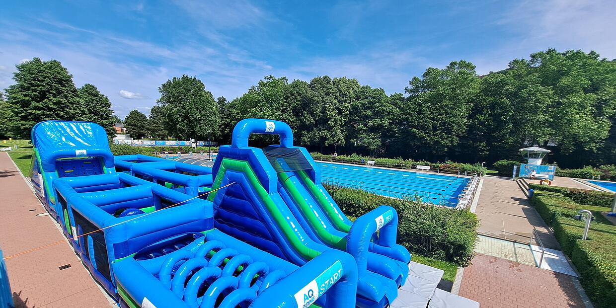 Dem Dritten Bürgermeister Can Aydin (SPD) läuft der Schweiß die Stirn herunter. „Ich werde morgen ganz schön Muskelkater haben“, sagt er scherzend. Zusammen mit SÜC-Chef Franz-Josef Loscar hat er gerade zum ersten Mal den neuen Hindernisparcours ausprobiert. Die aufblasbare, extra für das Aquaria angefertigte Hüpfburg mit diversen Hindernissen ist eine neue Attraktion, die das Bad für die Jugend attraktiv machen soll. Denn von einem anderen Highlight musste man sich verabschieden.