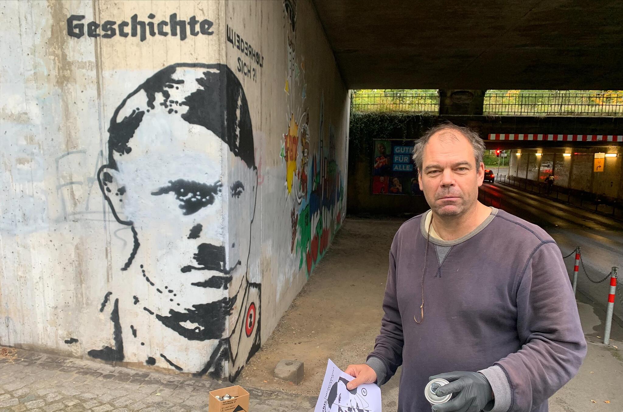 Wer war das? Erneute Attacke auf Hitler-Putin-Kunstwerk Am Silvestermorgen hatte plötzlich weder Hitler (links) noch Putin ein Gesicht mehr. Inzwischen hat der Coburger Sprayer Alex sein Kunstwerk aber wieder repariert. // Alex / privat von Oliver Schmidt TEILEN  02.01.2023 Coburg – Der Sprayer Alex musste im alten Jahr nochmal eine Extraschicht einlegen: Sein Gemälde in Coburg wurde erneut beschädigt. Das Hitler-Putin-Kunstwerk an der Judenberg-Unterführung in Coburg bleibt weiter ein Aufregerthema: Kaum, dass die Staatsanwaltschaft ihre Ermittlungen gegen den dafür verantwortlichen Alex eingestellt hat, wurde das Gemälde in der Nacht zum Silvestertag beschädigt. Der Sprayer Alex vor seinem Kunstwerk in Coburg. // Oliver Schmidt Unbekannte Täter haben die beiden Gesichtshälften derart übermalt, dass Hitler und Putin keine Augen mehr hatten. Alex nahm es mit Humor: „Geschichts-Verlust durch Gesichts-Verlust?“, fragte er auf seiner Facebookseite – und legte anschließend gleich mal eine Extraschicht ein: Er stellte den alten Zustand des Gemäldes wieder her. +++ Bleiben Sie mit uns auf dem Laufenden. Klicken Sie hier und melden Sie sich für unsere kostenlosen Newsletter an. +++ Lesen Sie auch: Fall für die Justiz Hitler-Putin-Wandbild: „Freispruch“ für den Künstler Ein Coburger wollte zum Nachdenken anregen – und hatte plötzlich ein Ermittlungsverfahren am Hals. Jetzt hat sich alles in Luft aufgelöst. Doch der Künstler kündigt bereits die nächste Aktion an. Hitzige Diskussion Aufregung um Hitler-Putin-Vergleich in Coburg Porträts von Hitler und Putin verschmelzen zu einem Gesicht: An einem Werk des Sprayers Alex scheiden sich die Geister. Viele finden den Vergleich passend – andere sehen eine Verharmlosung des Holocaust. Wer war das? Attacke auf Hitler-Putin-Gemälde in Coburg Das umstrittene Werk eines Sprayers ist verunstaltet worden. Der Künstler will sich davon aber nicht entmutigen lassen. Ärger in Coburg Hitler-Putin-Bild: Jetzt ermittelt die Staatsanwaltschaft Gegen den Sprayer Alex liegt eine Anzeige vor – wegen der Verwendung von „Kennzeichen verfassungswidriger Organisationen“. Diskussion in Coburg Hitler-Putin-Kunstwerk: Staatsanwaltschaft nimmt Stellung Fällt das umstrittene Gemälde in der Judenberg-Unterführung unter „Kunstfreiheit“?