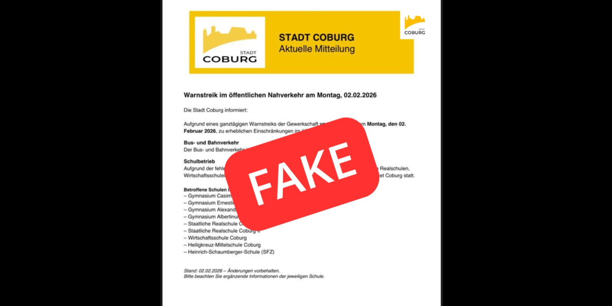 Die Schule fällt am Montag aus, weil im öffentlichen Nahverkehr gestreikt wird? Diese Meldung verbreitete sich am Sonntagabend im Netz und in diversen Elterngruppen. Als angeblicher Urheber wurde die Stadt Coburg genannt. Doch die Nachricht war gefälscht.