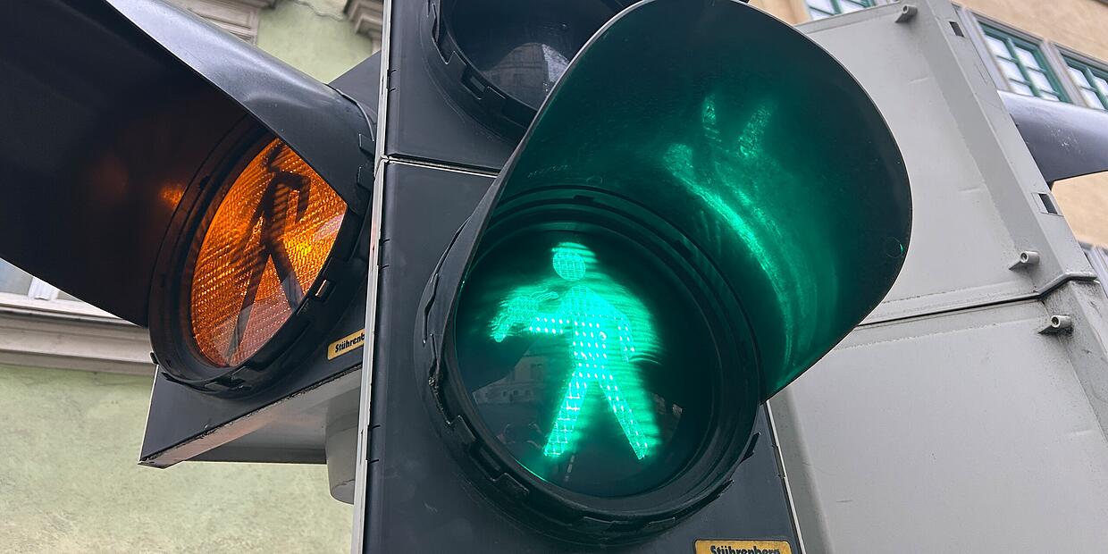 Das rote Ampelmännchen hat keine Bratwurst in der Hand. Dominik Sauerteig findet das nur logisch: „Wer nur herumsteht, kommt ja an keine Bratwurst!“ Umso größer dann die Erleichterung, wenn die Ampel auf „Grün“ schaltet und der Weg zur Bratwurst frei ist.