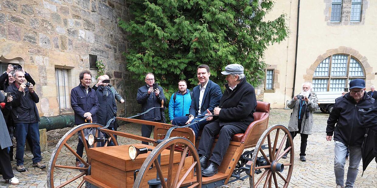 Nachbau auf der Veste Das erste deutsche Elektro-Auto kam aus Coburg Foto: Christoph Winter von Christoph Winter TEILEN  24.10.2025 Coburg – Der E-Wagen von Andreas Flocken aus dem Jahr 1888 erlebt seine Präsentation in Coburg auf der Veste. Im Burghof rasselt er über das Pflaster. Für eine Gans allerdings war die Erfindung damals fatal. Artikel anhören Sie können uns nicht hören? Diese Funktion können Sie exklusiv mit PLUS nutzen. Erhalten Sie uneingeschränkten Zugriff auf alle Audioinhalte, Artikel und vieles mehr. Vorlesefunktion freischalten Bereits -Zugriff? Jetzt Anmelden Na, erwischt! Du bist wohl ein bisschen zu neugierig, was?