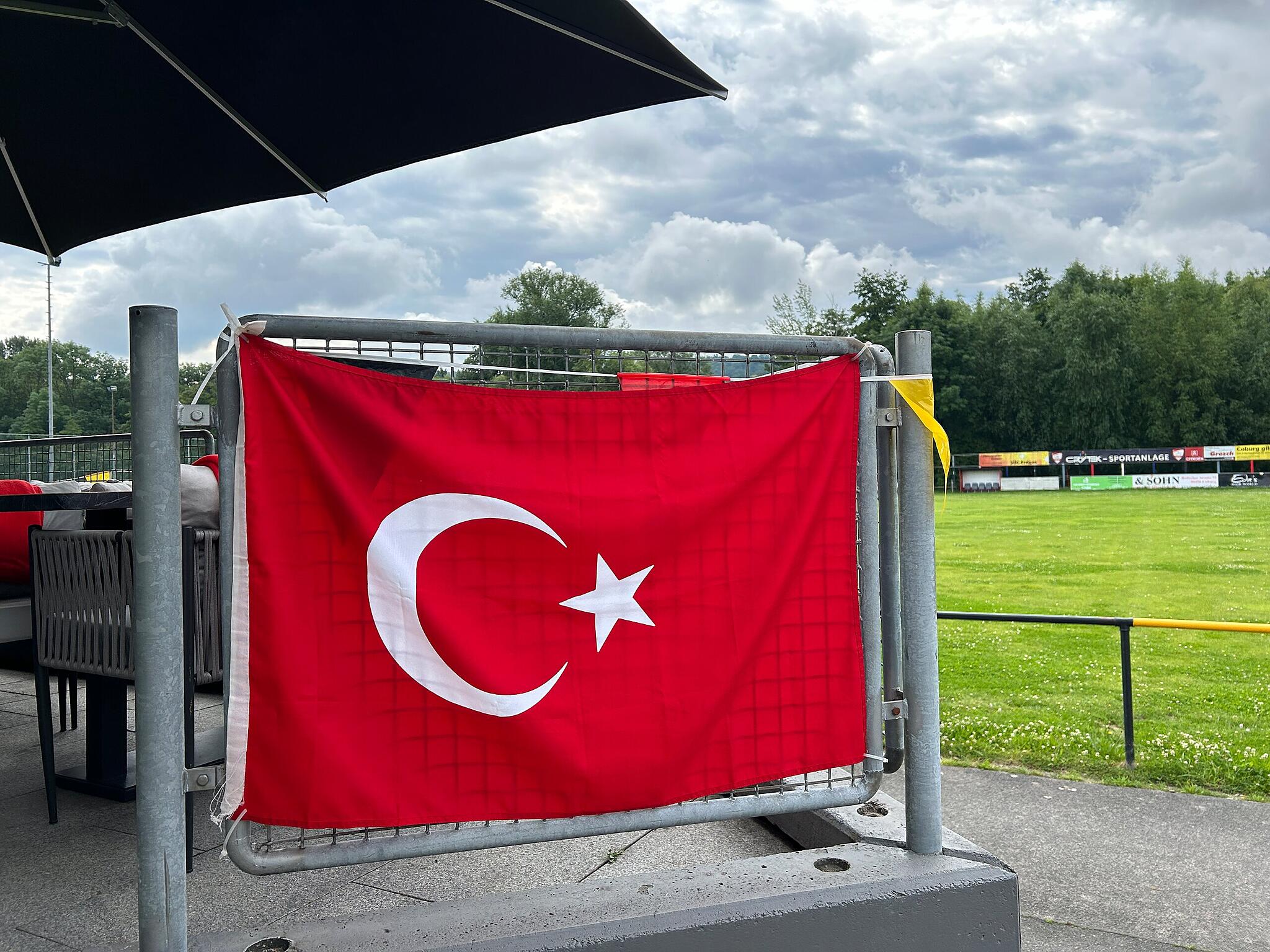 Neues Café in Coburg Mit Pizza und Burger bis ins Viertelfinale? Das Sportheim des SV Bosporus Coburg wurde deutsch-türkisch geschmückt. // Foto: Oliver Schmidt Das Sportheim des SV Bosporus Coburg wurde zur Fußball-EM geschmückt. // Foto: Oliver Schmidt von Oliver Schmidt Gastronomie TEILEN  20.06.2024 Coburg – Im Sportheim des SV Bosporus befindet sich jetzt das „Café Lux“. Die Inhaber bieten auch Public Viewing zur Fußball-EM an. Das Sportheim des SV Bosporus Coburg hat zuletzt für Aufsehen gesorgt. Denn am Eingang des Geländes am Hinteren Floßanger hängen nicht etwa türkische Fahnen, sondern deutsche. UPDATE Fußball-EM Türkisches Sportheim präsentiert sich in Schwarz-Rot-Gold Beim SV Bosporus Coburg wehen gleich mehrere deutsche Fahnen am Eingang des Sportgeländes. Veranlasst hat das der neue Wirt des ehemaligen Vereinsheims, das jetzt ein Café mit internationaler Küche ist. Veranlasst haben das die neuen Wirtsleute Basak Naime und Baris Osman. Sie haben das Sportheim gepachtet und dort ihr „Café Lux“ eröffnet. Basak Naime Osman ist gebürtige Coburgerin und hat griechische Wurzeln. Ihr Mann Baris wurde in Nürnberg geboren und hat türkische Wurzeln. Entsprechend international ist die Speisekarte im „Café Lux“. Unter anderem gibt es Pizza, Burger, Nudeln sowie türkische Speisen. Ab dem kommenden Dienstag wird auch ein Lieferservice angeboten. Fußball-EM Deutschland im Achtelfinale! So feiert Coburg Tolle Stimmung beim deutschen 2:0 gegen Ungarn. Im Josiasgarten war noch ein zusätzlicher Bierwagen aufgestellt worden. Bei einem anderen Public Viewing zeigte das Personal eine titelreife Leistung. Bereits an diesem Samstag freuen sich Basak Naime und Baris Osman über viele Gäste, die beim Public Viewing der türkischen Nationalmannschaft die Daumen drücken. Anpfiff der Partie gegen Portugal bei der Fußball-EM ist um 18 Uhr. Im „Café Lux“ gibt es sowohl im Innenbereich als auch auf der großen Terrasse jeweils 80 Plätze. Große Fernseher sind ebenfalls drinnen wie draußen vorhanden. Café Lux in Coburg: Wie sind die Öffnungszeiten? Die aktuellen Öffnungszeiten des „Café Lux“ sind dienstags bis sonntags jeweils von 17 bis 23 Uhr. Montag ist Ruhetag. In den nächsten Monaten ist aber noch eine Ausdehnung geplant. Mit einem Mittagstisch sollen ab dem Herbst nicht zuletzt die Mitarbeiterinnen und Mitarbeiter von Dietze & Schell angesprochen werden, deren Firma bekanntlich von der Karchestraße im Coburger Süden in den Hinteren Floßanger umzieht. In einer kleinen Grillbude, die noch aufgestellt wird, sollen außerdem Speisen wie Döner angeboten werden. Wer wird Europameister? Übrigens: Auch Baris Osman war vom Auftaktsieg der türkischen Nationalmannschaft sehr angetan. Dass die Türkei auch Europameister wird, glaubt er allerdings nicht. „Ich denke, sie schaffen es bis ins Viertelfinale.“ Blick über die Terrasse auf den Sportplatz des SV Bosporus Coburg. // Foto: Oliver Schmidt Sein Favorit auf den EM-Titel ist Frankreich. Das Endspiel der Fußball-EM findet am Sonntag, 14. Juli, statt. Ein weiteres Public Viewing in Coburg soll es dann auch auf der großen Bühne des Samba-Festivals auf dem Schlossplatz geben. Lesen Sie auch: Public Viewing Coburg ist bereit fürs nächste Sommermärchen Mehrere hundert Fans feierten im Josiasgarten den ungefährdeten 5:1-Sieg der Deutschen gegen Schottland. Bei Coburgs größtem Public Viewing musste aber auch kurz gezittert werden – vor dem Anpfiff. Bildergalerie Fußball-EM 2024: So feiert Coburg das 5:1 Wow, was für ein Auftakt! Beim 5:1 gegen Schottland fiebern und feiern auch in Coburg Tausende von Fußballfans. Im fränkischen Rio Söder erneut Schirmherr des Samba-Festivals Der bayerische Ministerpräsident wird gleich zur Eröffnung am Freitag, 12. Juli, in Coburg erwartet. Drei heiße Tage im Juli Samba-Festival: Was den Veranstaltern Mut macht In der ersten Vorverkaufswelle wurden 40 Prozent mehr Festival-Tickets verkauft als im vergangenen Jahr. Das erfreut die Samba-Macher. Denn hinter ihnen liegen schwierige Zeiten. Auch die Zukunft hält ein paar Herausforderungen parat.