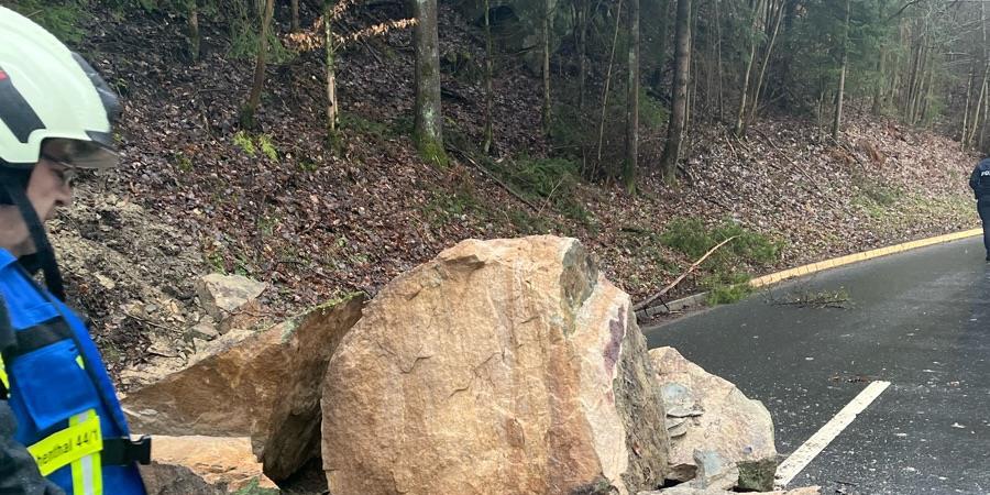 – Am Dienstag löst sich ein größerer Steinbrocken aus dem Hang und rollt auf die Ortsverbindungsstraße.