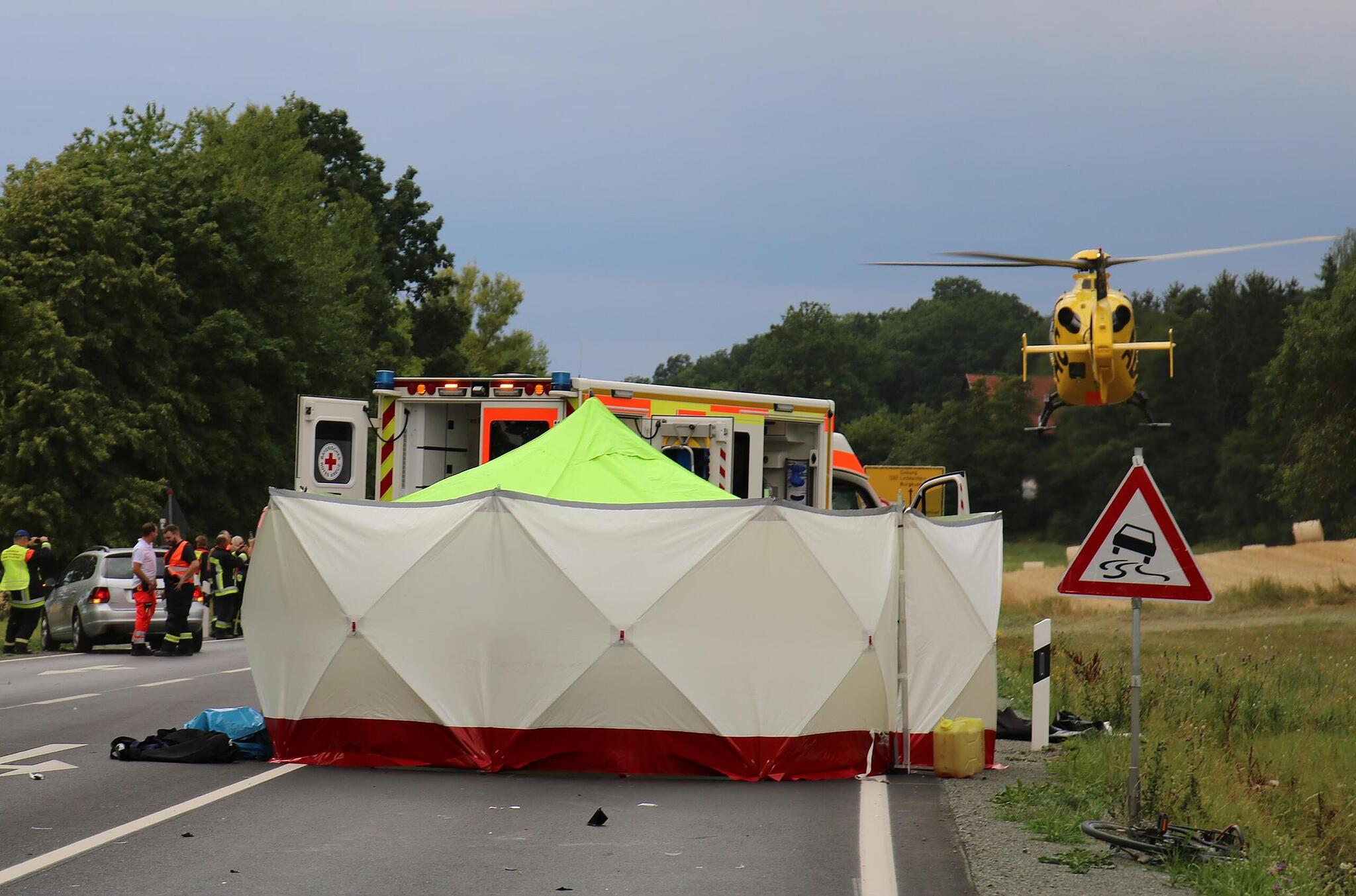 Unfall Burghaig: Radlerin stirbt bei Zusammenstoß mit Pkw Die Radfahrerin war beim Überqueren der Bundesstraße von einem Pkw erfasst worden, sie starb noch an der Unfallstelle. // Jochen Nützel Eine Absperrung schirmt die Tote vor Blicken Dritter ab. Der alarmierte Rettungshubschrauber wurde nicht benötigt. // Jochen Nützel von Jochen Nützel TEILEN  21.07.2023 Kulmbach – Tödliche Verletzungen erlitt am Freitagnachmittag eine 58-Jährige, die auf ihrem Rad auf Höhe der Gaststätte „Weinbrücke“ von einem Auto erfasst wurde. Laut Polizeiangaben ereignete sich der folgenschwere Unfall gegen 15.45 Uhr auf der B 289 zwischen Kulmbach und Mainleus. Die Radfahrerin war aus Richtung Burghaig gekommen und wollte auf Höhe der Abzweigung zur „Weinbrücke“ geradeaus die Bundesstraße überqueren, um auf der gegenüberliegenden Seite den Radweg zu benutzen. Beim Überqueren wurde die Frau von einem Fahrzeug, ein VW, seitlich erfasst. Durch den Zusammenprall stürzte die Radlerin auf die Fahrbahn. Trotz schnell eingeleiteter Reanimationsmaßnahmen erlitt die 58-Jährige bei der Kollision tödliche Verletzungen. Während der Versorgung und der Bergung leiteten Feuerwehr und Polizei den Verkehr um. Nach Rücksprache mit der Staatsanwaltschaft Bayreuth wird zur Klärung des Unfallhergangs ein Sachverständiger hinzugezogen. Lesen Sie auch: Zeugenaufruf Tödlicher Unfall: Polizei sucht weißen Kastenwagen Im Zuge der Ermittlungen zum tödlichen Verkehrsunfall am vergangenen Freitag sucht die Polizei Kulmbach nun nach einem weiteren Fahrzeug. Tödlicher Unfall Wie gefährlich ist die B289 für Radfahrer? Eine Radfahrerin ist beim Überqueren der Bundesstraße in Burghaig von einem Auto tödlich verletzt worden. Ein Kenner wünscht sich dort seit Jahren eine Ampel.
