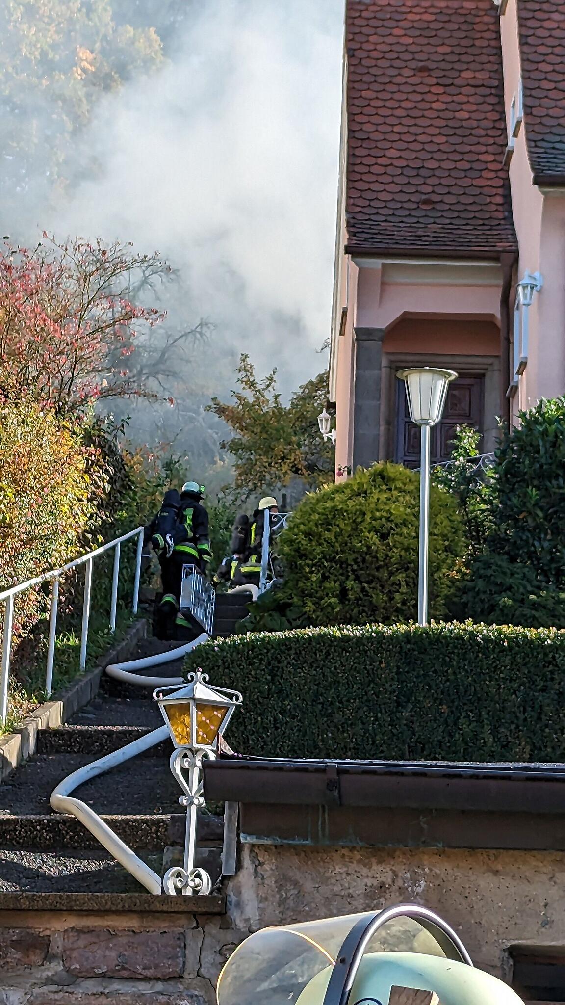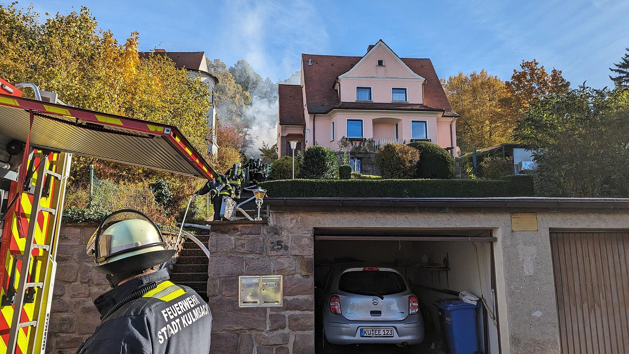 Grosseinsatz Wohnhaus in Kulmbach steht in Flammen // Dagmar Besand von Dagmar Besand TEILEN  30.10.2023 Kulmbach – In der Gustav-Adolf-Straße ist am Montagvormittag ein Feuer ausgebrochen. Die Lage des Gebäudes wird für die Retter zu einer großen Herausforderung. Dichte Rauchschwaden über der Gustav-Adolf-Straße, ein Großaufgebot an Feuerwehr, THW, Polizei und BRK: Ein Wohnhaus ist am Montagmorgen in Brand geraten. Die Besitzerin ist zu Hause, kann sich selbst retten und die Rettungskräfte alarmieren. // Dagmar Besand Kurz nach der Alarmierung gegen 9.30 Uhr rücken die ersten Fahrzeuge der Feuerwehr Kulmbach mit Einsatzleiter Michael Weich sowie Polizei, Rotes Kreuz und Notarzt an. Zwei Räume im Erdgeschoss stehen zu diesem Zeitpunkt im Vollbrand, die Flammen haben auf das Dachgeschoss übergegriffen. 100 Feuerwehrleute im Einsatz Schnell ist klar: Es werden noch viel mehr Fahrzeuge und Helfer gebraucht, um die Wasserversorgung zu sichern. Es folgen weitere Kräfte der Feuerwehren Kauerndorf, Mainleus, Rothwind, Fassoldshof und Höferänger, Lehenthal, Leuchau, der Schlauchwagen aus Kasendorf und die Atemschutzlogistik aus Stadtsteinach. Insgesamt waren rund 100 Feuerwehrleute in der Gustav-Adolf-Straße im Einsatz.Der Brandort ist für die Retter eine echte Herausforderung. Das Haus liegt hoch am Hang, der einzige Weg hinauf führt über eine steile Treppe. Das macht die Löscharbeiten aufwendig, erläutert Yves Wächter, Pressesprecher der Landkreisfeuerwehren. // Dagmar Besand So gab es wegen der steilen Hanglage keine Möglichkeit, eine Drehleiter zu stellen, die Löschfahrzeuge konnten nicht an den Brandort fahren. „Das heißt, alles, was wir brauchen, müssen wir rund 200 Meter die Treppe hochtragen.“ 12.000 Liter Wasser im Tank E werden im Eiltempo Wasserrohre zum brennenden Haus gelegt: In drei Tanklöschfahrzeugen stehen für den Erstangriff auf die Flammen 12.000 Liter Wasser zur Verfügung. Nachschub kommt über einen Hydranten in der Gustav-Adolf-Straße und über eine weitere Leitung vom Siechengrund aus. Die Feuerwehrleute mussten auch das Dach des Hauses teilweise abdecken, um an die verbliebenen Glutnester im First zu kommen. Glück im Unglück: Keine Verletzten Verletzte gibt es glücklicherweise nicht. Außer der Besitzerin war zum Zeitpunkt des Unglücks niemand im Haus. Die benachbarten Häuser in dem Wohngebiet waren nicht gefährdet, so Yves Wächter. Das brennende Haus steht frei und ist von Garten umgeben. Die Kripo Bayreuth ermittelt Nachdem der Brand gelöscht ist, übernimmt die Kriminalpolizei Bayreuth am Nachmittag die Ermittlungen und versucht, die Brandursache zu bestimmen. Ein technischer Defekt ist wahrscheinlich, aber noch nicht bestätigt.Das Haus ist komplett zerstört und nicht mehr bewohnbar. Die Schadenshöhe schätzt die Polizei auf mehr als 100.000 Euro, teilt die Pressestelle des Präsidiums mit. // Dagmar Besand Im Einsatz waren in der Gustav-Adolf-Straße neben 100 Feuerwehrleuten und 15 Helfern des THW mehrere Polizisten und das BRK mit zwei Rettungswagen und einem Notarzt. Lesen Sie auch: Wohnhausbrand Feuertragödie in Kulmbach: Ursache steht fest Nach Auswertung aller Spuren der Feuertragödie kann die Polizei nun die Identität der beiden toten Frauen bestätigen. Als Auslöser des Brandes gilt ein technischer Defekt. Festnahme Feuer bei Kirchleus absichtlich gelegt Jetzt gibt es Gewissheit: Beim Brand bei Kirchleus vergangene Woche wurde nachgeholfen. Der mutmaßliche Brandstifter sitzt in Haft. Und es war vielleicht nicht seine erste Tat. Kripo ermittelt Spurensuche nach tödlichem Feuer in Kulmbach Ein Expertenteam der Polizei ist noch immer damit beschäftigt, herauszufinden, wie es zu dem verheerenden Brand gekommen ist, bei dem zwei Menschen gestorben sind. Ermittlungen Polizei kennt Herkunft des Brandstifters von Kirchleus Der 25-Jährige, der vor zehn Tagen wegen des Verdachts auf Brandstiftung festgenommen wurde, sitzt nach wie vor in Untersuchungshaft.