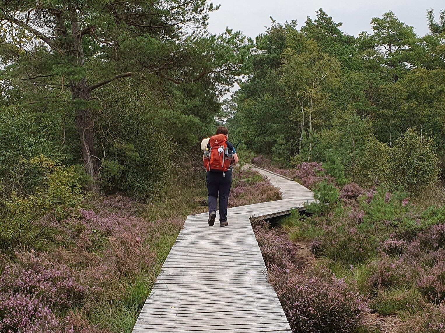 Wandertagebuch, Teil 4 Knutschende Bäume – wo gibt’s denn sowas? Küssende Eichen und Buchen können auf dem Alfred-Toepfer-Pfad bestaunt werden. // Christine Fischer von Christine Fischer TEILEN  27.08.2023 Rugendorf – Vierte Etappe des Heidschnuckenweges: Zum ersten Mal nutzen wir den Heide-Shuttle, außerdem gesellen sich zur lila Blütenpracht morbide Moorlandschaften – und wir müssen die Regenjacken auspacken. Doch von Anfang an. Weil wir statt der offiziellen Etappe 5 lieber eine Wegvariante laufen wollen, bei der wir auch am Pietzmoor bei Schneverdingen vorbeikommen, entschließen wir uns nach unserer Übernachtung in Niederhaverbeck, am Morgen den Bus zu nehmen. Von Mitte Juli bis Mitte Oktober befördern die kostenlosen Heide-Shuttles Wanderer und Fahrradfahrer auf fünf verschiedenen Runden durch den kompletten Naturpark Lüneburger Heide. Wir steigen in Schneverdingen aus und marschieren auf einem Holzbohlenweg rund fünf Kilometer durch die wildromantische und manchmal fast etwas gruselige Wasserlandschaft des Pietzmoors. Wichtigstes Accessoire auf dem Moor-Erlebnisweg ist das Anti-Mückenspray. Zwei Rugendorferinnen unterwegs: Wandern für die Seele Nur einen Gang über die Straße entfernt breitet sich die Osterheide aus, eine der größten zusammenhängenden Heideflächen der Lüneburger Heide. Es ist ausnahmsweise bewölkt, und außer uns sind kaum Wanderer oder Radfahrer unterwegs. Die unaufgeregte Stille tut gut, wir laufen und lassen den Blick schweifen über das lilafarbenen Blütenmeer. Der vierte Tag auf dem Heidschnuckenweg in der Lüneburger Heide // FOTOGALERIE Christine Fischer Der vierte Tag auf dem Heidschnuckenweg in der Lüneburger Heide // FOTOGALERIE Christine Fischer Der vierte Tag auf dem Heidschnuckenweg in der Lüneburger Heide // FOTOGALERIE Christine Fischer Der vierte Tag auf dem Heidschnuckenweg in der Lüneburger Heide // FOTOGALERIE Christine Fischer Der vierte Tag auf dem Heidschnuckenweg in der Lüneburger Heide // FOTOGALERIE Christine Fischer Der vierte Tag auf dem Heidschnuckenweg in der Lüneburger Heide // FOTOGALERIE Christine Fischer Der vierte Tag auf dem Heidschnuckenweg in der Lüneburger Heide // FOTOGALERIE Christine Fischer Wandern für die Seele. Wir passieren das kleine Möhrer Moor mit seinem Naturlehrpfad und staunen im angrenzenden Wald über verschlungene Doppelbäume. Eichen und Buchen wachsen dort in inniger Umarmung, manche Stämme treffen sich auf halber Höhe zu einem Kuss. Heidschnuckenweg: Erstmals müssen die Regenjacken ran Bis zum geschichtsträchtigen Gutshof auf dem Tütsberg, der mittlerweile ein Hotel beherbergt, müssen wir ein paar Höhenmeter auf schnurgeraden Waldwegen zurücklegen. Die Kaffeepause haben wir uns kurz vor dem Tagesziel redlich verdient. Und dann erwischt uns auf den letzten Kilometern bis nach Behringen doch tatsächlich noch ein leichter Regenschauer, und wir müssen zum allerersten Mal auf unserer Heidschnucken-Wanderung die Regenjacken auspacken. Lesen Sie auch: Wandertagebuch Von Nacktwanderern und Heide-Bullis Zwei Superlative und viele interessante Begegnungen hält Tag 3 auf dem Heidschnuckenweg für die Wanderinnen Christine Fischer und Sandra Zeitler bereit. Besondere Reise Zwei Rugendorferinnen gehen 200 Kilometer zu Fuß Sandra Zeitler und Christine Fischer machen sich auf zu einer langen Wandertour in Norddeutschland. Sich eine Region zu Fuß zu „erarbeiten“, hat für die beiden Frauen einen besonderen Reiz. Wandertagebuch Steiler Anstieg und ein freundlicher „Hausmeister“ Sandra Zeitler und Christine Fischer sind derzeit auf einer langen Wandertour in Norddeutschland unterwegs. An dieser Stelle berichten sie regelmäßig über ihre Erlebnisse. Wandertagebuch Himmel und Hölle an einem Tag Tag 2 beschert den Heidschnucken-Wanderinnen Christine Fischer und Sandra Zeitler herrliche Aussichten, aber auch eine ganz besondere Herausforderung.
