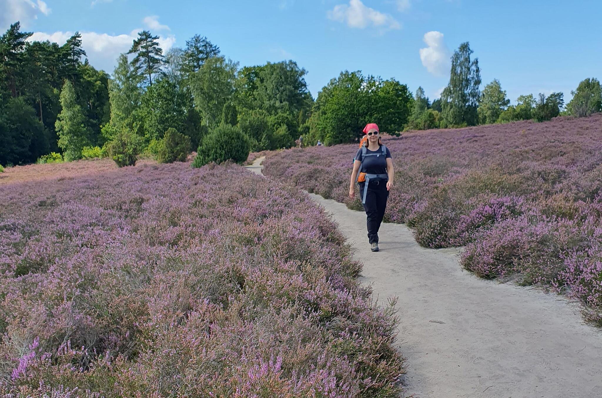 Wandertagebuch Heidschnuckenweg: Die 150 Kilometer sind fast voll Den Heidschnuckenweg-Pin in Bronze haben sich Sandra Zeitler (im Bild) und Christine Fischer schon erlauben, jetzt streben sie Silber an. // Christine Fischer von Christine Fischer TEILEN  28.08.2023 Kulmbach – Die Fernwanderinnen Christine Fischer und Sandra Zeitler sind mittlerweile in der Südheide angekommen. Das Schicksal meint es gut mit uns an Tag 5 auf dem Heidschnuckenweg. Während wir ausnahmsweise einmal wieder im kostenlosen Heide-Shuttle sitzen, um von unserer letzten Zieletappe Behringen zum nächsten Startpunkt in Wietzendorf zu gelangen, schüttet es draußen wie aus Kübeln. In regelrechten Sturzbächen rinnt das Wasser von den Busscheiben. Das sind die schönsten Bilder der Etappen: Diese Schaukel mussten die Wanderinnen natürlich ausprobieren. // FOTOGALERIE Christine Fischer Müden an der Örzte ist ein besonders malerisches Heidedorf. // FOTOGALERIE Christine Fischer Den Heidschnuckenweg-Pin in Bronze haben sich die beiden Rugendorferinnen schon erlaufen. Jetzt streben sie Silber an. // FOTOGALERIE Christine Fischer Der Lönsstein am Wietzer Berg // FOTOGALERIE Christine Fischer Alte, stolze Bauernhöfe passiert man in dem Heidedorf Schmarbeck. // FOTOGALERIE Christine Fischer Immer wieder gibt es Infotafeln in der Heide. // FOTOGALERIE Christine Fischer In Faßberg geht man ein langes Stück an dem riesigen Bundeswehr-Stützpunkt entlang. // FOTOGALERIE Christine Fischer Eindrücke aus der Wacholderheide bei Faßberg in der Südheide // FOTOGALERIE Christine Fischer Die beiden Wanderinnen Christine Fischer (links) und Sandra Zeitler sind immer noch gut drauf. // FOTOGALERIE Christine Fischer Eindrücke aus der Wacholderheide bei Faßberg in der Südheide // FOTOGALERIE Christine Fischer BR-Reporterin Christine Fischer läuft durch die Heidelandschaft am Wietzer Berg. // FOTOGALERIE Christine Fischer Im Imkerdorf Wietzendorf startete die Tour an Tag 5. // FOTOGALERIE Christine Fischer Zwei Tagestouren lassen die Wanderinnen aus Zeitgründen aus Mit der Fahrt überspringen wir die Etappen um Bispingen und Soltau, es sind die einzigen beiden Tagestouren der offiziellen Wegführung, die wir aus Zeitgründen auslassen. Als wir eine Stunde später in dem Imkerdorf Wietzendorf aussteigen, strahlt die Sonne vom blau-weißen Himmel, und es ist trocken. Alles richtig gemacht, sagen wir uns, und stapfen erstmal zur Tourist-Info, um uns unseren Stempel für den Wanderpass abzuholen. Pro gelaufene Etappe gibt es den begehrten Abdruck. Schon den Heidschnuckenweg-Pin in Bronze erlaufen Wir haben längst sechs Stempelfelder voll, und das bedeutet: Wir dürfen uns den Heidschnuckenweg-Pin in Bronze an unseren Rucksack heften. Silber und Gold sind die nächsten Stufen. Na, wenn das keine Motivation ist! +++ Bleiben Sie mit der Bayerischen Rundschau auf dem Laufenden und holen Sie sich unsere kostenlosen Newsletter. +++ Es ist bereits später Vormittag, also höchste Zeit loszulaufen, schließlich haben wir für diesen Tag mal wieder zwei Etappen zusammengelegt. Zunächst geht es von Wietzendorf in Richtung Wietzer Berg, wo dem berühmten Heimatdichter Hermann Löns ein stattliches Denkmal errichtet wurde. Er liebte die Heidelandschaft rund um den Berg und kam hierher, um Kraft zu tanken. Eines der Postkartenmotive aus der Lüneburger Heide schlechthin Während wir auf einer Bank sitzen und den Blick schweifen lassen, können wir ihn gut verstehen: die Aussicht auf das violette Blütenmeer, durchsetzt von Wacholder, und bis ins Örtzetal ist atemberaubend und eines der Postkartenmotive aus der Lüneburger Heide schlechthin. Vom Wietzer Berg ist es nicht mehr weit bis ins malerische Heidedorf Müden. Kopfsteinpflasterstraßen, alte Fachwerkhäuser und liebevoll gepflegte Bauerngärten machen den Ort zu einem der schönsten Dörfer der Region. Müden liegt am Flüsschen Örtze, es gibt eine Badestelle und einen See. Die allgegenwärtigen Mücken nerven die Rugendorferinnen Wir folgen auf der sich nun anschließenden Etappe der Uferlinie der Örzte, die völlig unberührt von Menschenhand in ihrem natürlichen Flussbett vor sich hin plätschern darf. Wie ein Dschungelpfad schlängelt sich der Weg durch den dichten Wald, einzig die allgegenwärtigen Mücken nerven. Mittlerweile merken wir es an unseren brennenden Fußsohlen, das Tagesziel Faßberg kann nicht mehr weit sein. Nach doch wieder kräftezehrenden 27 Kilometern erreichen wir die von den Nazis in den 1930er Jahren auf dem Reißbrett geplante Fliegerhorst-Siedlung. Faßberg spielte eine zentrale Rolle für die „Rosinenbomber“ Faßberg spielte eine zentrale Rolle während der Berliner Luftbrücke in den Jahren 1948 und 1949. Hier landeten die zur Versorgung von West-Berlin eingesetzten amerikanischen Transportflugzeuge, die sogenannten Rosinenbomber. Noch heute erinnert das Luftbrückenmuseum in Faßberg an diese Zeit. Diese Details hätten wir so ohne unsere Tour nicht gewusst, auch ein Grund, warum wir solche Weitwanderungen schätzen: man lernt unheimlich viel an der Strecke. Wir starten mit der Gewissheit in Tag 6, dass wir mehr als die Hälfte bereits geschafft haben, der Schrittzähler schon 130 Kilometer anzeigt. Und das spüren wir inzwischen natürlich etwas in Beinen und Füßen. In der Südheide sind fast keine Touristen unterwegs Aber Jammern ist beim Fernwandern keine Option, also Zähne zusammenbeißen und weiter geht's. Mittlerweile sind wir im Naturpark Südheide angekommen, hier geht es unaufgeregter zu, so gut wie keine Touristen sind unterwegs, und auch andere Wanderer treffen wir kaum noch. Dabei sind die südlichen Heideflächen nicht weniger spektakulär. Überhaupt stellen wir fest: Heide ist nicht gleich Heide. Jedes Gebiet hat seine eigene Charakteristik. Die Farben der Blüten changieren in allen nur erdenklichen Rosa- und Lila-Tönen, mal gibt es Wacholder und Birken zwischen dem Heideteppich, mal Gras, mal ist es hügelig, dann wie