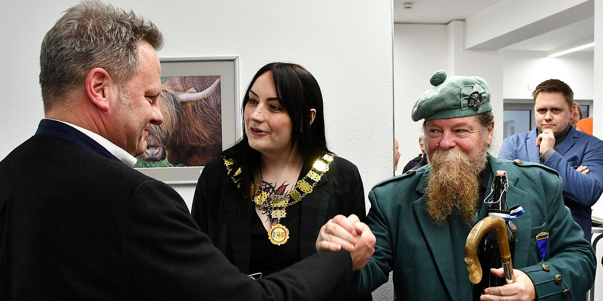 Kulmbach– Zur Ausstellungseröffnung kommen sogar Gäste aus Kulmbachs Partnerstadt Kilmarnock. Und eine Stadträtin spielt gekonnt den Dudelsack.