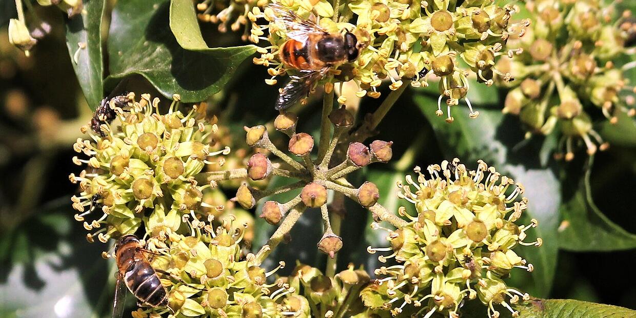 Besonders in den späten Sommer- und Herbstmonaten entfaltet Efeu seine volle Pracht: Von Ende August bis in den Oktober hinein blühen seine gelben Blüten und werden dann von zahlreichen Insekten wie Schwebfliegen und Bienen regelrecht umschwärmt. Gerade zu dieser Jahreszeit, in der nur noch wenige Pflanzen blühen, ist Efeu eine unverzichtbare Nahrungsquelle.