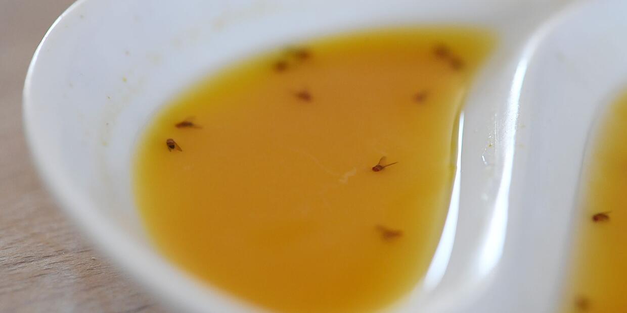 Einfaches Hausmittel Nervige Küchengäste: So stellen Sie Fruchtfliegen eine Falle Lästige Fruchtfliegen: Mit ein paar Handgriffen kann man einen Befall vermeiden. // Klaus-Dietmar Gabbert/dpa-tmn Eine Obstschale mit einem Netz kann Insekten von vornherein fernhalten. // Franziska Gabbert/dpa-tmn Mit einer Mixtur aus Apfelsaft, Rotwein oder Balsamico schnappt die Fruchtfliegenfalle zu. // Andrea Warnecke/dpa-tmn von dpa TEILEN  vor 16 Stunden Mainz/Würzberg – Sie sind zwar nicht gefährlich, aber unappetitlich: Fruchtfliegen mögen Obst und Weinreste im Glas und kommen daher gern mal in unsere Küche. Gegen die ungebetenen Gäste hilft ein simples Hausmittel. Ein Griff in die Obstschale und plötzlich fliegen sie in alle Richtungen davon: da haben sich Fruchtfliegen breit gemacht. Die kleinen Plagegeister sind zwar nicht gefährlich, aber in der Küche ziemlich lästig. Sie können zum Beispiel Früchte schneller verderben lassen, indem sie Sporen von Hefepilzen und Bakterien übertragen, so die Verbraucherzentrale Rheinland-Pfalz. Prof. Silke Sachse untersucht an der Julius-Maximilians-Universität Würzburg, wie Fruchtfliegen ihr Verhalten von Gerüchen leiten lassen. Im Grunde funktioniert ihr Geruchssystem so ähnlich wie das von Menschen, es ist nur weniger komplex. Der Duft von reifem Obst, Essig und Alkohol lockt sie an: Sie wittern einen Ort, an dem sie Nahrung finden und ihre Eier ablegen können. Und so lockt man sie auch in die Falle. Mit nur zwei Zutaten: Fruchtfliegenfalle bauen Fruchtfliegeneier sind zwar Sachse zufolge nicht giftig und unsere Magensäure wird gut mit ihnen fertig. Wer sie dennoch nicht auf Äpfeln oder Birnen haben möchte, kann den Fruchtfliegen ganz einfach eine Falle stellen. Dafür mischt man in einem Schälchen etwas Apfelsaft, Rotwein oder Balsamicoessig mit einem Tropfen Spülmittel. Der säuerliche Geruch zieht die Fruchtfliegen an. Durch das Spülmittel sinkt die Oberflächenspannung der Mischung. Die Fliegen gehen also direkt unter und ertrinken, wenn sie sich dort niederlassen. Damit Fliegen gar nicht erst kommen: Küche rein halten So eine Falle lohnt sich besonders dann, wenn die Fruchtfliegen schon da sind. Um sie von vornherein fernzuhalten, rät die Verbraucherzentrale Rheinland-Pfalz: Obstschalen mit einem Netz oder Baumwolltuch abzudecken, Wein- und Saftgläser direkt abzuspülen, Abfälle zu beseitigen und die Arbeitsfläche in der Küche sauber zu halten. Tipp: Auch regelmäßiges Lüften hilft, die Küche frei von gärenden Gasen zu halten, die Fruchtfliegen anlocken können.