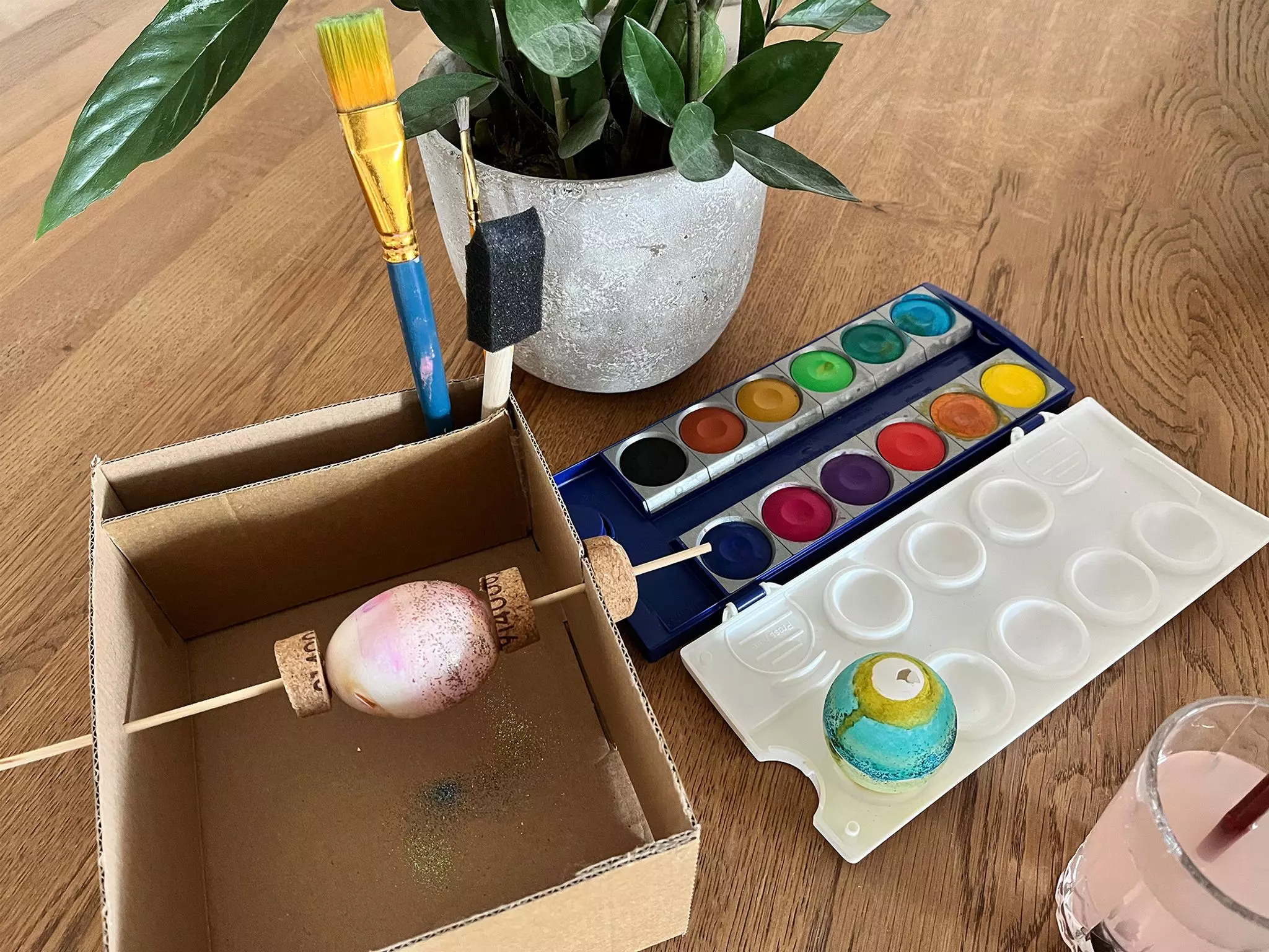 Kreative Bastelidee Ostereier bemalen mit Kindern - so geht's ohne Fingertapser Drehen statt kleckern: Mit Holzspieß, Korken und Karton entsteht eine Mal-Station für Ostereier. // DIY Academy/dpa-tmn von dpa TEILEN  10.04.2025 Köln – Bunte Eier erschaffen, macht Kindern viel Freude. Mit einem Trick landen keine Fingerabdrücke auf der frischen Farbe - einfach vorher gemeinsam eine Mal-Station bauen. Und so geht es. Bald ist Ostern und Sie wollen gemeinsam mit ihren Kindern Eier bunt bemalen? Mit einer selbstgebauten Mal-Station gelingt es mühelos - ohne, dass die ausgeblasenen Eier dabei zerbrechen oder Fingerabdrücke auf den frischen Kunstwerken landen. So lassen sich die Ostereier kinderleicht rundherum gleichmäßig bemalen. Mit etwas Glück bleiben so sogar die Finger sauber. Beim Bauen dieser Mal-Station können die Kinder helfen - ein kleines Projekt für die ganze Familie. Die DIY Academy aus Köln erklärt, wie es Schritt für Schritt geht - und welche Materialien Sie dafür brauchen. Mal-Station für Ostereier - Materialliste Karton - etwa 15 Zentimeter breit × 10 Zentimeter hoch × 20 Zentimeter tief Weinkorken Holzspieß Perle oder kleine Kugel Nagel und Hammer Schneidmatte und Cuttermesser Heißklebepistole mit Heißklebe-Sticks Bauanleitung - Schritt für Schritt Und so geht es - hier die Anleitung der DIY Academy: Karton zuschneiden - also die Laschen abschneiden und bei Bedarf auf die passende Größe bringen (15 × 10 × 20 Zentimeter). Drehvorrichtung montieren - mit dem Cuttermesser mittig auf einer Seitenwand des Kartons einen Schlitz schneiden, der etwa ein Zentimeter breit und drei Zentimeter breit ist. Auf der gegenüberliegenden Seite dann ein kleines Loch in die Wand stechen – dies dient zur Führung des Spießes. Eierhalterung stabilisieren - dafür einen Korken in drei gleich große Stücke teilen. In die Mitte der Korken-Teile jeweils ein Loch bohren. Dafür am besten einen Nagel mit Hammer verwenden. Das Loch sollte größer als der Holzspieß sein, damit dieser leicht hindurchpasst. Alles zusammensetzen - zwei der drei Korken-Teile dienen als Halterung für die Eier. Der dritte Korken fixiert den Spieß und verhindert so, dass dieser verrutscht. Um die Eier einfacher zu drehen - auf der Außenseite zusätzlich eine Perle oder kleine Kugel als Drehknauf mit Heißkleber befestigen. Und schon können Sie mit dem Bemalen der Eier loslegen. Wer Lust hat, kann noch ein Extrafach einbauen. Dort können die bemalten Eier sowie Pinsel und Malutensilien trocknen. Dafür ein Stück Pappe als Trenner zuschneiden - es sollte wie der Karton etwa 15 Zentimeter breit sein. Bei der Höhe zwei Zentimeter für die Bodenverklebung dazu rechnen. Die Trennwand mit Flüssigkleber oder Heißkleber befestigen - dafür die Lasche mit etwa zwei Zentimetern Abstand zur Kartonwand am Boden fixieren. Um den Trenner zu stabilisieren, vier schmale Streifen aus Pappe ausschneiden (etwa 1 x 5 Zentimeter). Diese seitlich links und rechts an die Kartonwände kleben. Als Halterung für die bemalten Eier am besten Holzspieße in Korken drücken und diese ins Extrafach stellen. Trick - wie Sie bemalte Ostereier problemlos aufhängen Sind die ausgeblasenen Ostereier bemalt und getrocknet, kann man sie an einen Zweig hängen. Damit dies einfacher funktioniert, verrät die DIY Academy noch einen Trick: Faden auf die gewünschte Länge bringen und daran ein kleines Stück Streichholz binden. So kann man den Faden einfach in das obere Loch im Ei stecken. Im Inneren verkeilt sich das Holzstäbchen quer - so bleibt der Faden sicher an Ort und Stelle. Fertig!