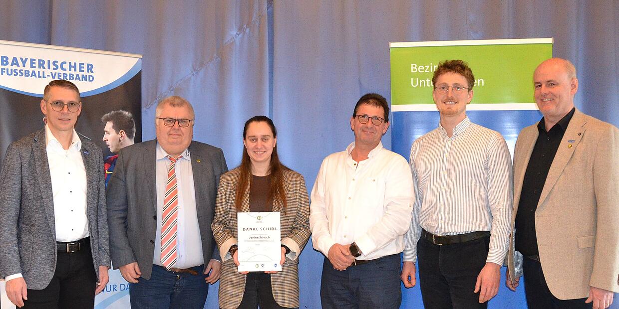 Janine Schoch aus Stralsbach ist seit zehn Jahren Schiedsrichterin und setzt damit eine Familientradition fort. Über drei Generationen steht der Name Schoch für große Leidenschaft für das Schiedsrichterhobby und für bemerkenswerten Einsatz für die Schiedsrichtergruppe Bad Kissingen. Janine kommt inzwischen auf knapp 200 Spielleitungen und 69 Partien als Assistentin. Sie unterstützt Nachwuchs-Referees als Patin und wirbt als Frauenfußballerin auch im Vereinsumfeld für Neulingskurse und für Akzeptanz für die Unparteiischen. Von ihrem großen Interesse für Athletik und Fitness profitiert nicht nur ihre Mannschaft, sondern sie brachte auch schon Impulse in die Fördergruppe ein.