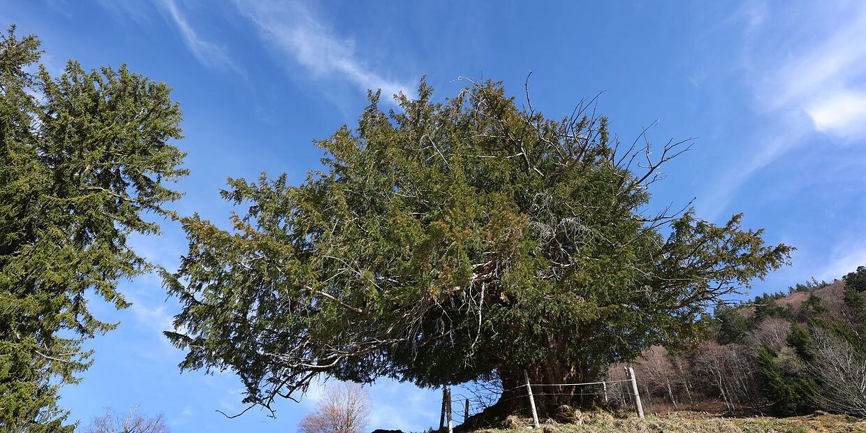Der Baum wächst einzeln auf der Weide. Nicht weit entfernt gebe es aber einen «Junior»-Nachkömmling, der etwa ein Drittel so alt sein könnte. Eibenzweige seien für Rinder giftig, hieß es. Die zuständige Weidegenossenschaft berichte aber, dass die Tiere kaum an den Zweigen fressen.