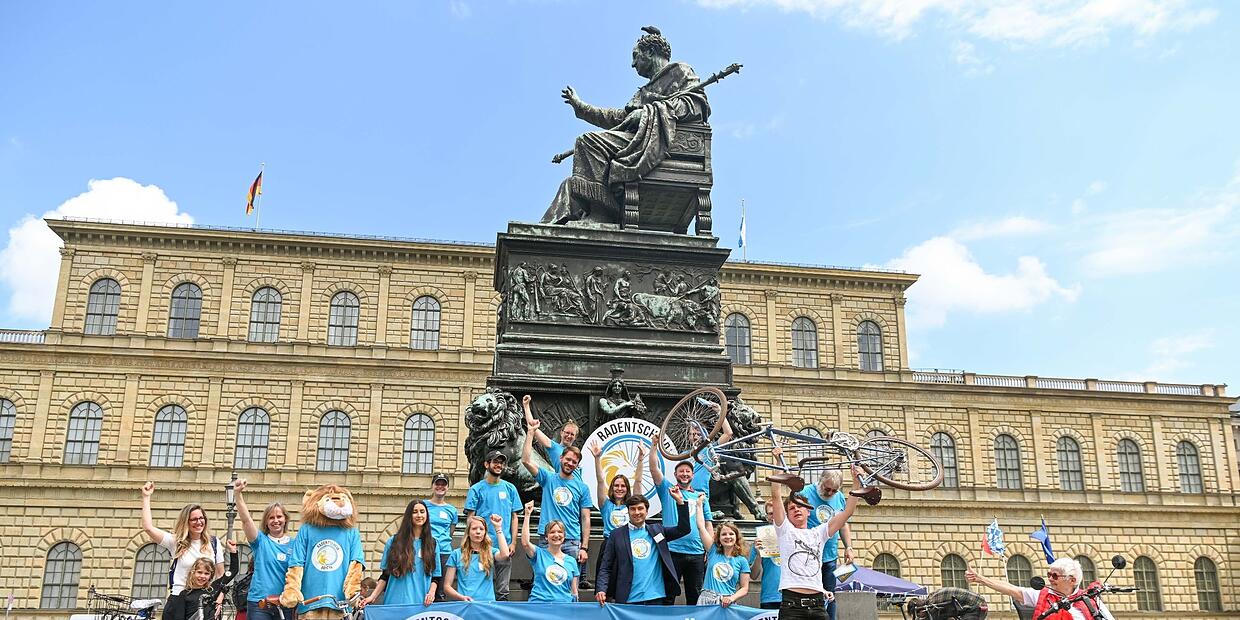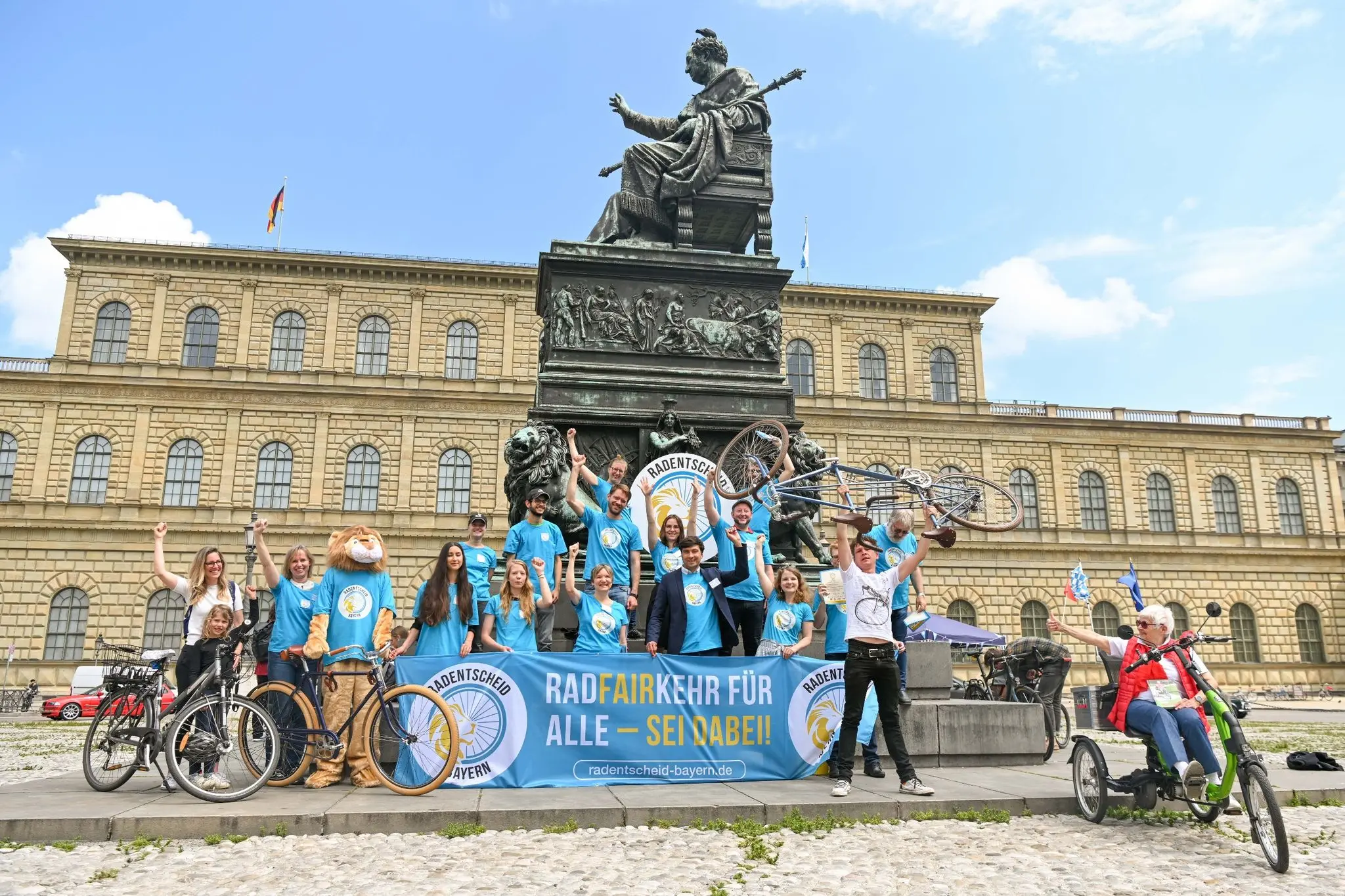 Verkehr Bündnis will Volksbegehren für bayernweites Radnetz Aktivisten und Unterstützer des Volksbegehrens «Radentscheid Bayern» stehen am Max-Joseph-Platz für ein Gruppenfoto zusammen. // 7 Tobias Hase/dpa von dpa TEILEN  02.06.2022 München – Ein Bündnis aus Verbänden und Parteien fordert ein bayernweites Fahrradnetz und will das mit einem Volksbegehren erreichen. «An weit über der Hälfte der Staats- oder Bundesstraßen gibt es keinerlei Radwege», sagte die Vorsitzende des Allgemeinen Deutschen Fahrrad-Clubs (ADFC) in Bayern, Bernadette Felsch, am Donnerstag in München. Ziel des «Radentscheids» sei es, das Radfahren sicherer und attraktiver zu machen. Die Unterschriftensammlung dazu werde am 16. Juni starten. Der Antrag auf Zulassung des Volksbegehrens muss von mindestens 25.000 Stimmberechtigten unterzeichnet werden.