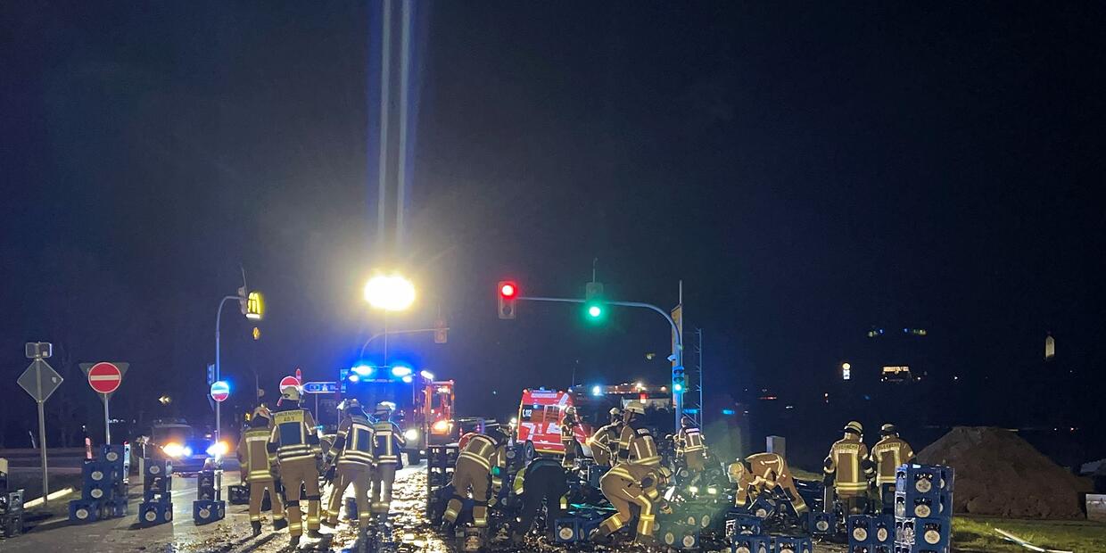 Die Kästen und zerbrochenen Flaschen seien über die ganze Fahrbahn verteilt gelegen. Die B303 wurde daraufhin für rund vier Stunden gesperrt und gereinigt, wie der Sprecher sagte. Verletzt wurde demnach niemand. Den Schaden schätzt die Polizei auf etwa 50.000 Euro.