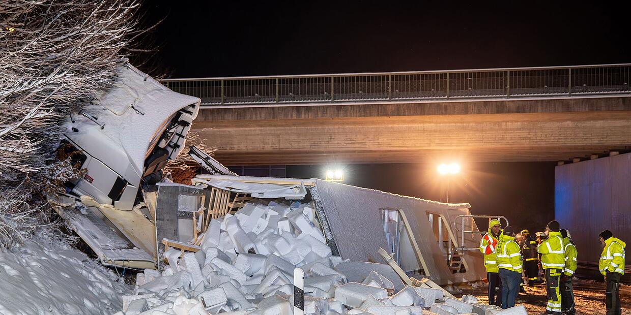 Bei einem Unfall auf schneebedeckter Fahrbahn ist der Anhänger eines Lastwagens aufgeplatzt und hat seine Lachs-Ladung auf der Autobahn in der Oberpfalz verteilt. Der Lastwagen war am Abend wegen der Straßenverhältnisse auf der A93 bei Wernberg-Köblitz (Landkreis Schwandorf) ins Rutschen geraten und gegen einen Erdwall gefahren, wie die Polizei mitteilte. Der mit 20 Tonnen Fisch beladene Lastwagen kippte zur Seite.
