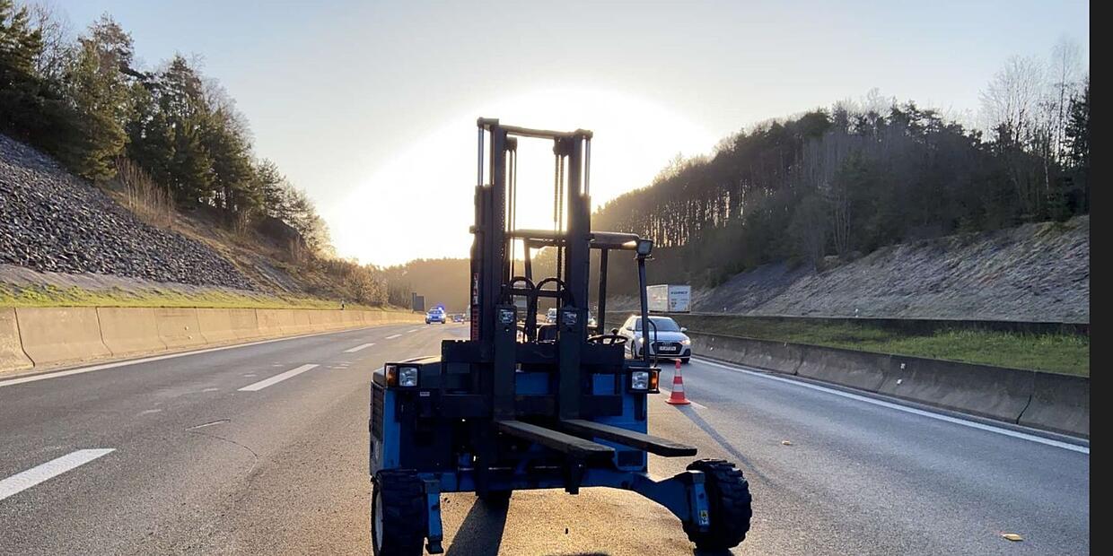 Der Fahrer des Lastwagens habe den Verlust bei Plech (Landkreis Bayreuth) zunächst nicht bemerkt. Später rief er laut Polizei seinen Disponenten an und vermutete, dass sein Stapler gestohlen wurde. Der Disponent habe allerdings bereits eine Verkehrsmeldung zu dem verlorenem Gabelstapler gehört und bei der Polizei angerufen.