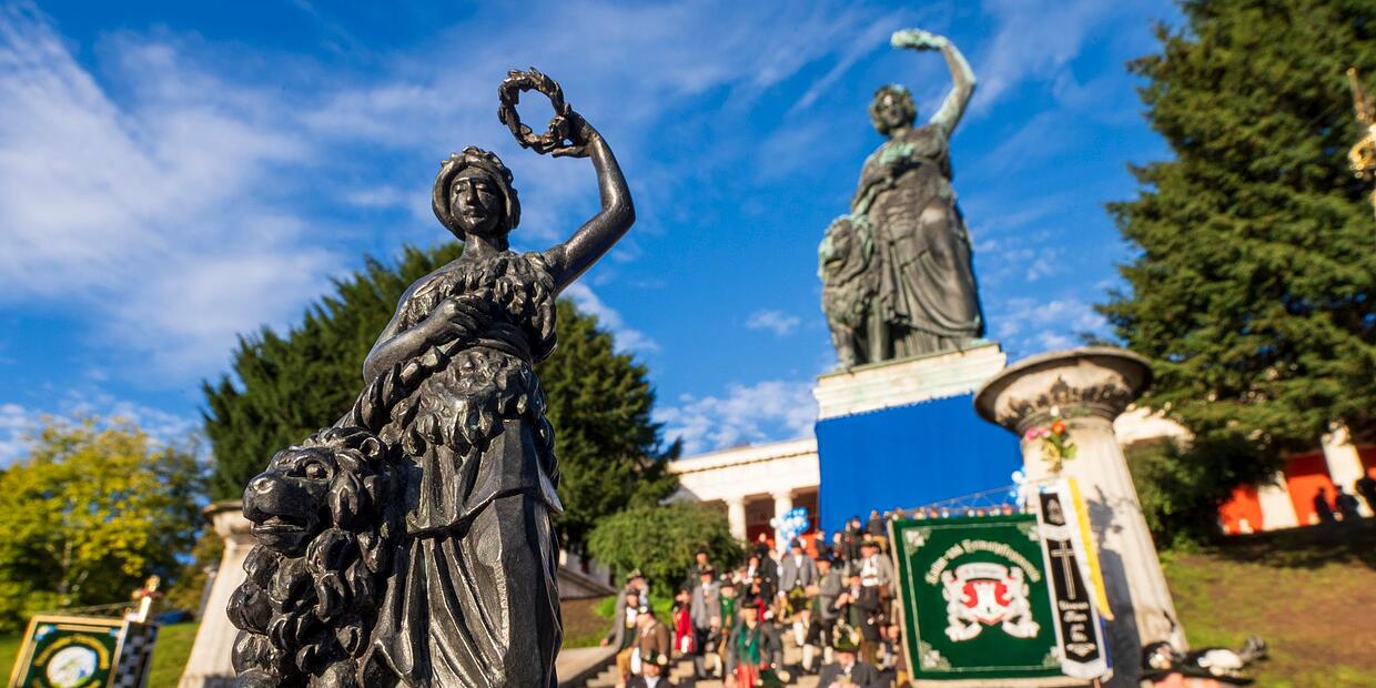 Schutzpatronin des Freistaats Wahrzeichen Bayerns: Die Bavaria ist 175 Jahre alt Seit 175 Jahren thront die Bavaria über der Theresienwiese. // Peter Kneffel/dpa Mit Eichenkranz, Schwert und Löwe steht die Schutzpatronin Bayerns für Ruhm, Kraft und Ehre des Freistaats. // Peter Kneffel/dpa Von der Masse der verwendeten Bronze ist die Bavaria die größte, von der Höhe eine der größten Bronzegüsse der Welt. // Peter Kneffel/dpa von dpa TEILEN  vor 19 Stunden München – Fast 19 Meter hoch, 87 Tonnen schwer und innen begehbar: Die Bavaria wacht seit Generationen über das Oktoberfest. Nun wird sie selbst gefeiert. Artikel anhören Sie können uns nicht hören? Diese Funktion können Sie exklusiv mit PLUS nutzen. Erhalten Sie uneingeschränkten Zugriff auf alle Audioinhalte, Artikel und vieles mehr. Vorlesefunktion freischalten Bereits -Zugriff? Jetzt Anmelden Seit 175 Jahren thront die Bavaria als Wahrzeichen Bayerns über der Münchner Theresienwiese. Die gewaltige Bronzestatue steht als Symbol für die Stärke, Einheit, Freiheit und Tradition des Freistaats. Die Figur wurde ab dem Jahr 1840 im Auftrag von König Ludwig I. von dem Bildhauer Ludwig von Schwanthaler geschaffen und nach dessen Tod von Ferdinand von Miller fertiggestellt. Mit einer Höhe von fast 19 Metern und einem Gewicht von 87 Tonnen gilt sie als technische Meisterleistung und ist laut bayerischem Heimatministerium eine der größten Bronzegüsse der Welt. «Die Bavaria ist eine Ikone und Symbolgestalt: Sie steht mit Eichenkranz, Schwert und Löwe für Ruhm, Kraft und Ehre», betonte Ministerpräsident Markus Söder (CSU) anlässlich des Festaktes zum Jahrestag der Enthüllung. Die berühmte Statue der Schutzpatronin Bayerns ist die einzige begehbare Großbronze in Deutschland und prägt die Theresienwiese der Landeshauptstadt, auf der jedes Jahr Millionen Besucher aus aller Welt das Oktoberfest feiern. Heimatminister Albert Füracker (CSU) erläuterte: «Sie ist unser stolzes Gesicht, ein Symbol, das auch in Zukunft für unsere Werte und unsere Gemeinschaft stehen wird.»