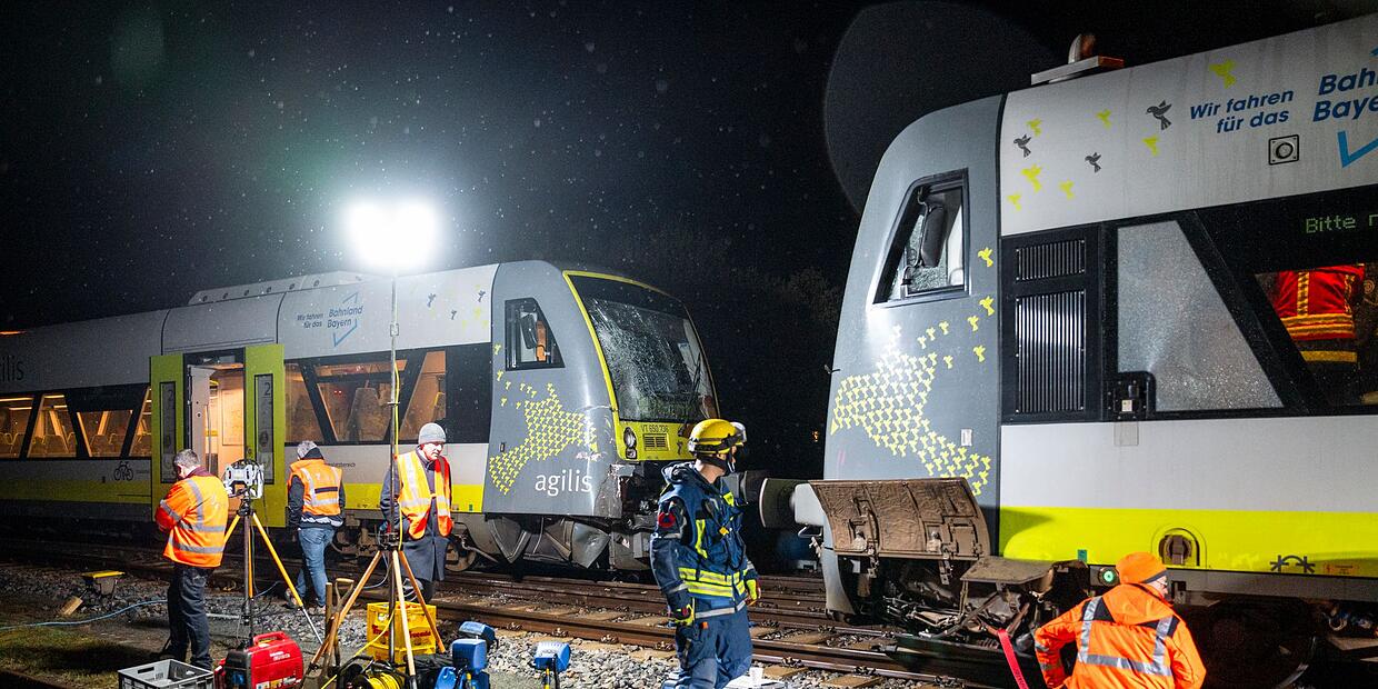 Nach bisherigen Erkenntnissen waren am Mittwochabend gegen 18.45 Uhr zwei Agilis-Züge zusammengestoßen. Eine Bahn mit 13 Fahrgästen an Bord fuhr demnach in den Bahnhof ein, der zweite Zug war ohne Fahrgäste auf einer Rangierfahrt zum Betanken unterwegs. Nach Polizeiangaben wird unter anderem geprüft, ob der Lokführer des rangierenden Zugs womöglich seinen einfahrenden Kollegen übersehen hat. Die Ermittlungen zur Unfallursache begannen noch am Mittwochabend.