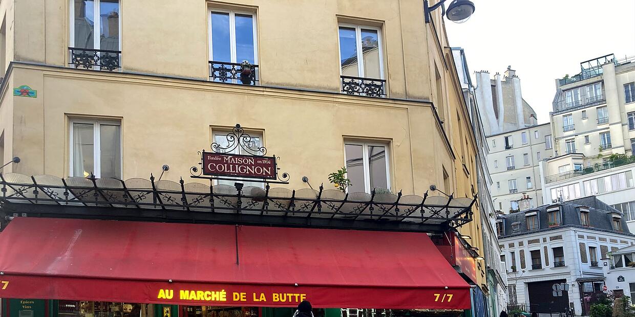 An der Épicerie hängt noch immer das Filmplakat. Die Auslage wirkt unverändert. Hier kaufte Jeunets Filmheldin ein – und rächte sich auf ihre eigene Weise am hartherzigen Gemüsehändler, der seinen Angestellten schlecht behandelte: mit vertauschter Zahnpasta, Salz im Schnaps und kleinen Streichen, die ihn langsam an seinem Verstand zweifeln ließen.