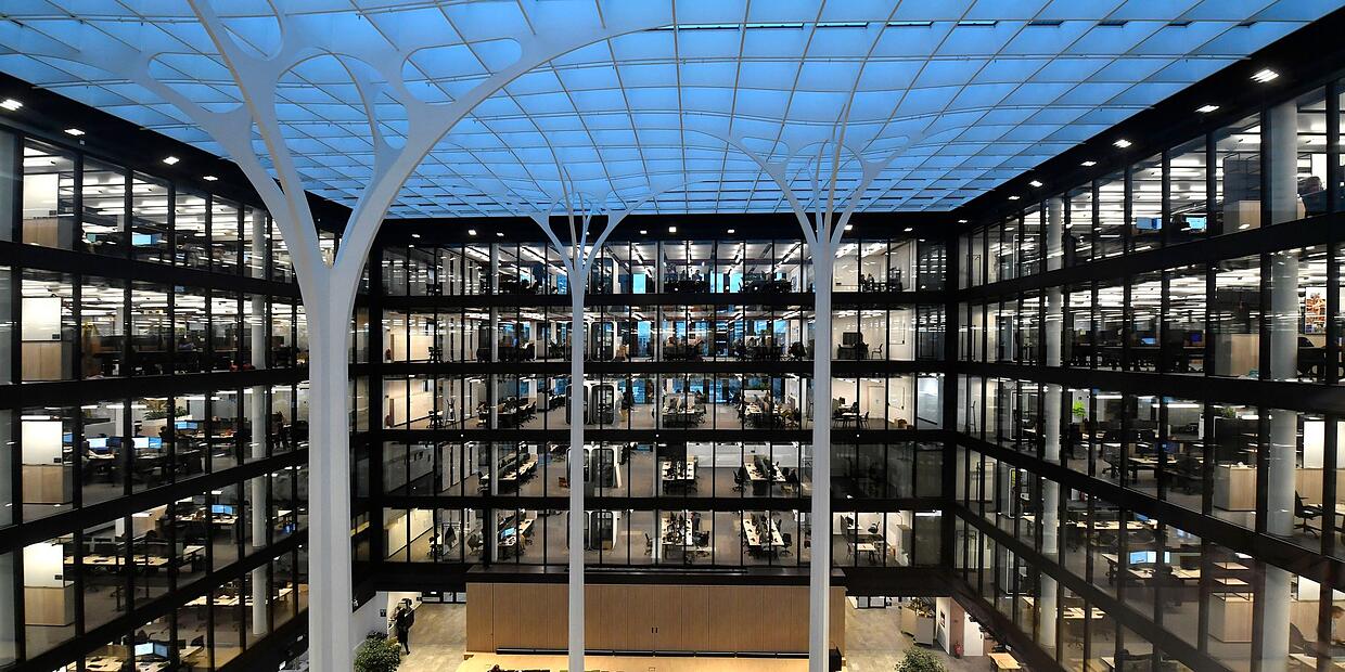 Ungeachtet der andauernden Wirtschaftskrise in Deutschland sind in der Tech-Branche nach wie vor qualifizierte Fachkräfte gesucht. Das neue Gebäude ist mit allerlei Annehmlichkeiten für die Belegschaft ausgestattet, unter anderem einem Kino und Yogaräumen.