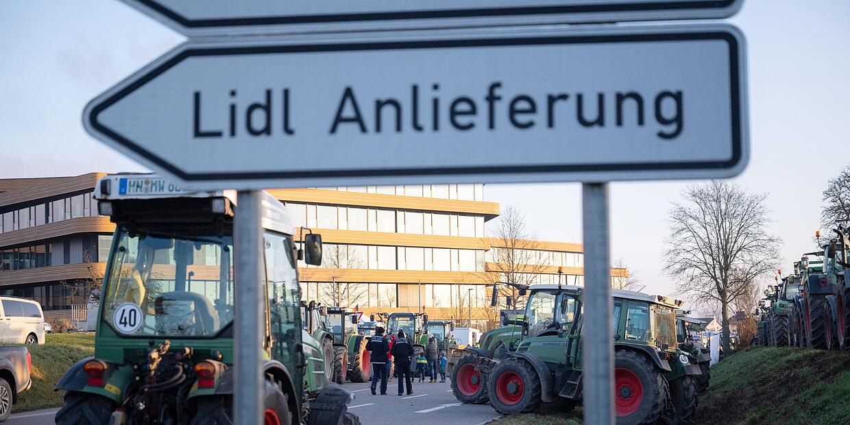 Warnleuchten und blockierte Straßen: Angesichts sinkender Preise vor allem für Milch und Butter haben Landwirte mit Traktoren vor der Lidl-Zentrale in Bad Wimpfen (Baden-Württemberg) gegen die Preispolitik des Discounters protestiert.